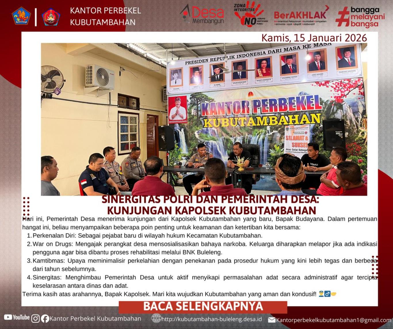 KUBUTAMBAHAN – Dalam rangka mempererat tali silaturahmi dan koordinasi antarinstansi, Kapolsek Kubutambahan yang baru, Bapak Budayana, melaksanakan kunjungan resmi ke Kantor Perbekel Kubutambahan pada Kamis (15/1/2026).