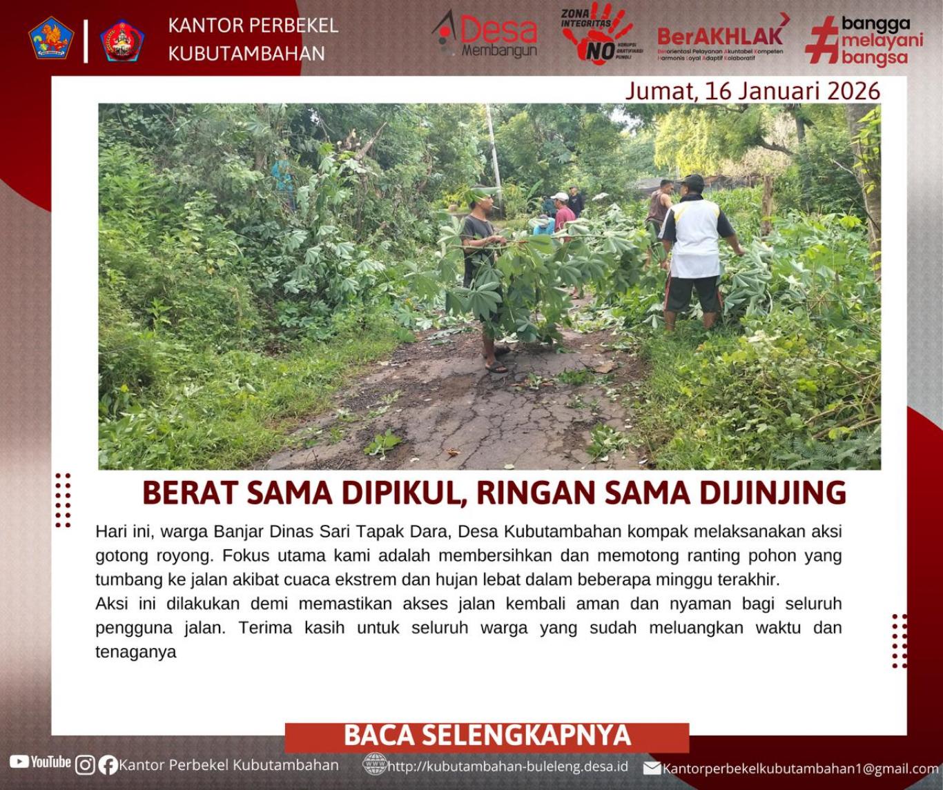 KUBUTAMBAHAN – Menanggapi tingginya intensitas curah hujan belakangan ini, warga Banjar Dinas Sari Tapak Dara, Desa Kubutambahan, menunjukkan aksi nyata dalam menjaga keamanan dan kenyamanan lingkungan. Pada Jumat (16/1/2026), seluruh elemen masyarakat turun ke jalan untuk melaksanakan kegiatan gotong royong massal.