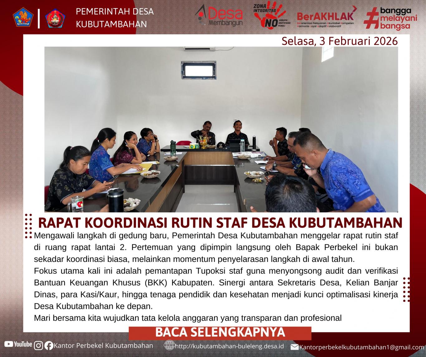 KUBUTAMBAHAN – Bertempat di ruang rapat lantai 2 gedung baru Kantor Desa Kubutambahan, telah dilaksanakan rapat rutin staf pada Selasa, 3 Februari 2026. Pertemuan ini menjadi momentum penting bagi jajaran perangkat desa untuk menyelaraskan langkah di awal tahun, terutama dalam menghadapi dinamika anggaran dan pemeliharaan aset desa.