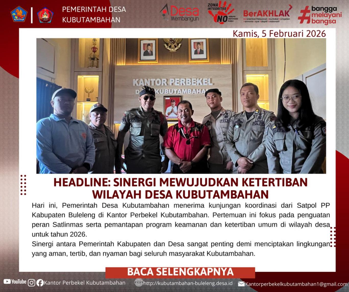 KUBUTAMBAHAN – (Kamis, 6 Pebruari 2026) Dalam upaya memperkuat sinergi demi menciptakan lingkungan yang kondusif, Pemerintah Desa Kubutambahan menerima kunjungan koordinasi dari jajaran Satuan Polisi Pamong Praja (Satpol PP) Kabupaten Buleleng dan Satpol PP Kecamatan Kubutambahan. Pertemuan ini berlangsung khidmat di Kantor Perbekel Kubutambahan pada hari ini.
