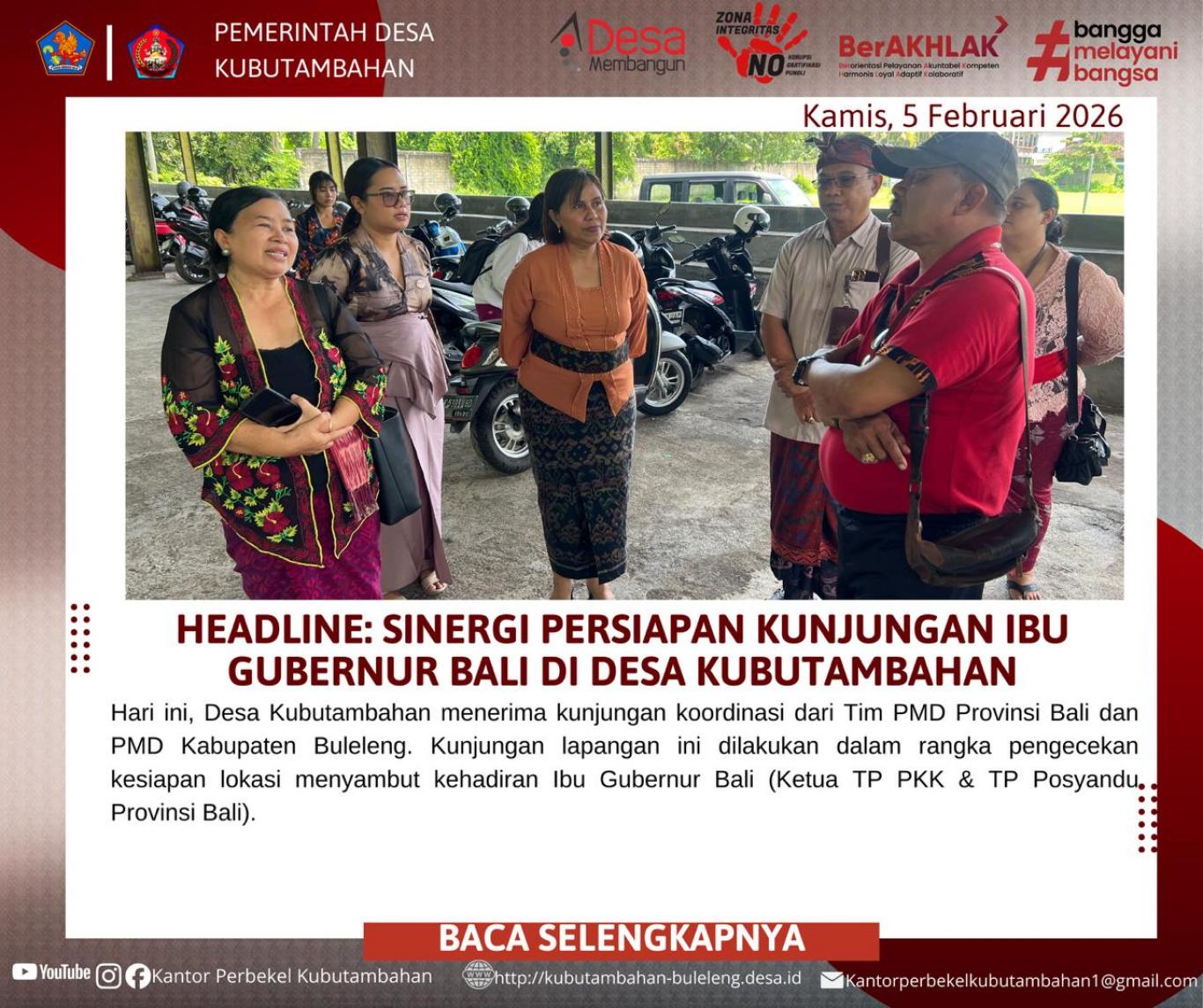 Pemerintah Desa Kubutambahan berkomitmen untuk memberikan penyambutan terbaik. Kehadiran Ibu Gubernur Bali beserta rombongan nantinya diharapkan dapat memberikan motivasi tambahan bagi para kader desa untuk terus meningkatkan kualitas pelayanan masyarakat, khususnya dalam program kesehatan dan pemberdayaan perempuan.