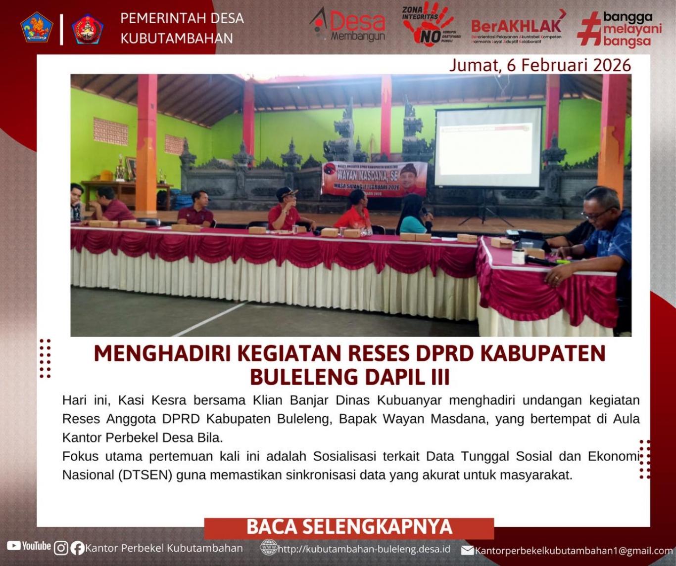 KUBUTAMBAHAN – Dalam upaya memastikan bantuan pemerintah tepat sasaran, agenda Reses Anggota DPRD diselenggarakan di Aula Kantor Perbekel Desa Bile pada hari ini, Jumat, 6 Februari 2026. Pertemuan ini menjadi krusial karena fokus pada pembenahan basis data kemiskinan dan kesejahteraan masyarakat.