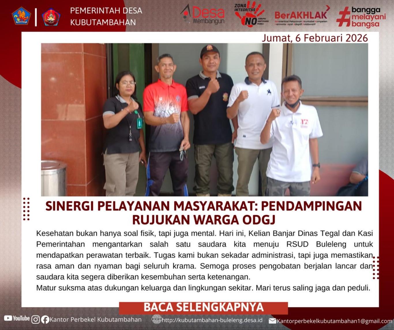 KUBUTAMBAHAN – Bentuk kepedulian terhadap kesehatan mental masyarakat kembali ditunjukkan oleh Pemerintah Desa Kubutambahan. Pada hari ini, Jumat, 6 Februari 2026, Pemerintah Desa Kubutambahan bersama personil Satpol PP Kecamatan Kubutambahan melakukan aksi kemanusiaan berupa pendampingan rujukan bagi warga dengan gangguan jiwa (ODGJ).