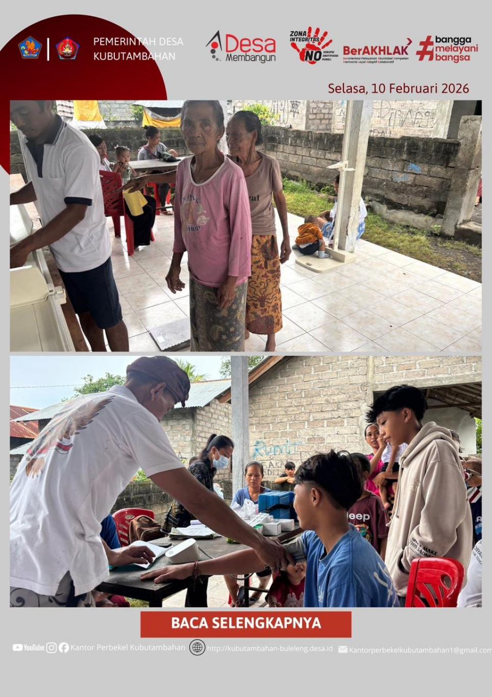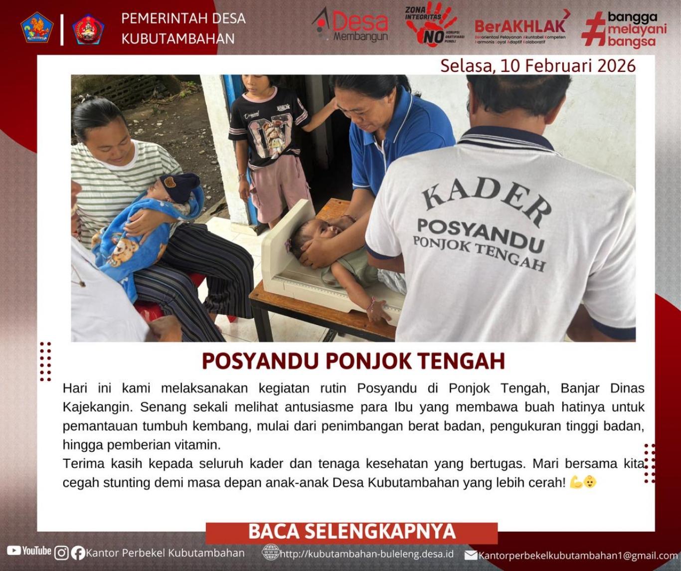 KUBUTAMBAHAN – Pelayanan kesehatan dasar berbasis masyarakat kembali dilaksanakan secara optimal di wilayah Desa Kubutambahan. Pada hari ini, Selasa, 10 Februari 2026, telah berlangsung kegiatan Posyandu Ponjok Tengahyang bertempat di Banjar Dinas Kajekangin.