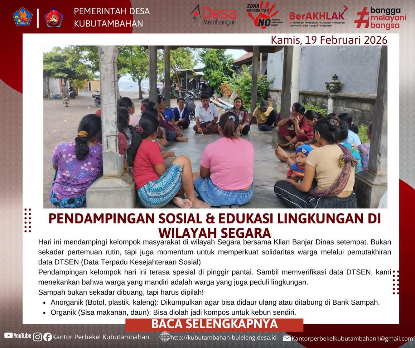 Di sisi lain desa, tepatnya di wilayah pesisir (Segara), telah dilaksanakan kegiatan pendampingan kelompok masyarakat bersama Klian Banjar Dinas setempat. Pertemuan yang berlangsung hangat di pinggir pantai ini memiliki dua misi utama: