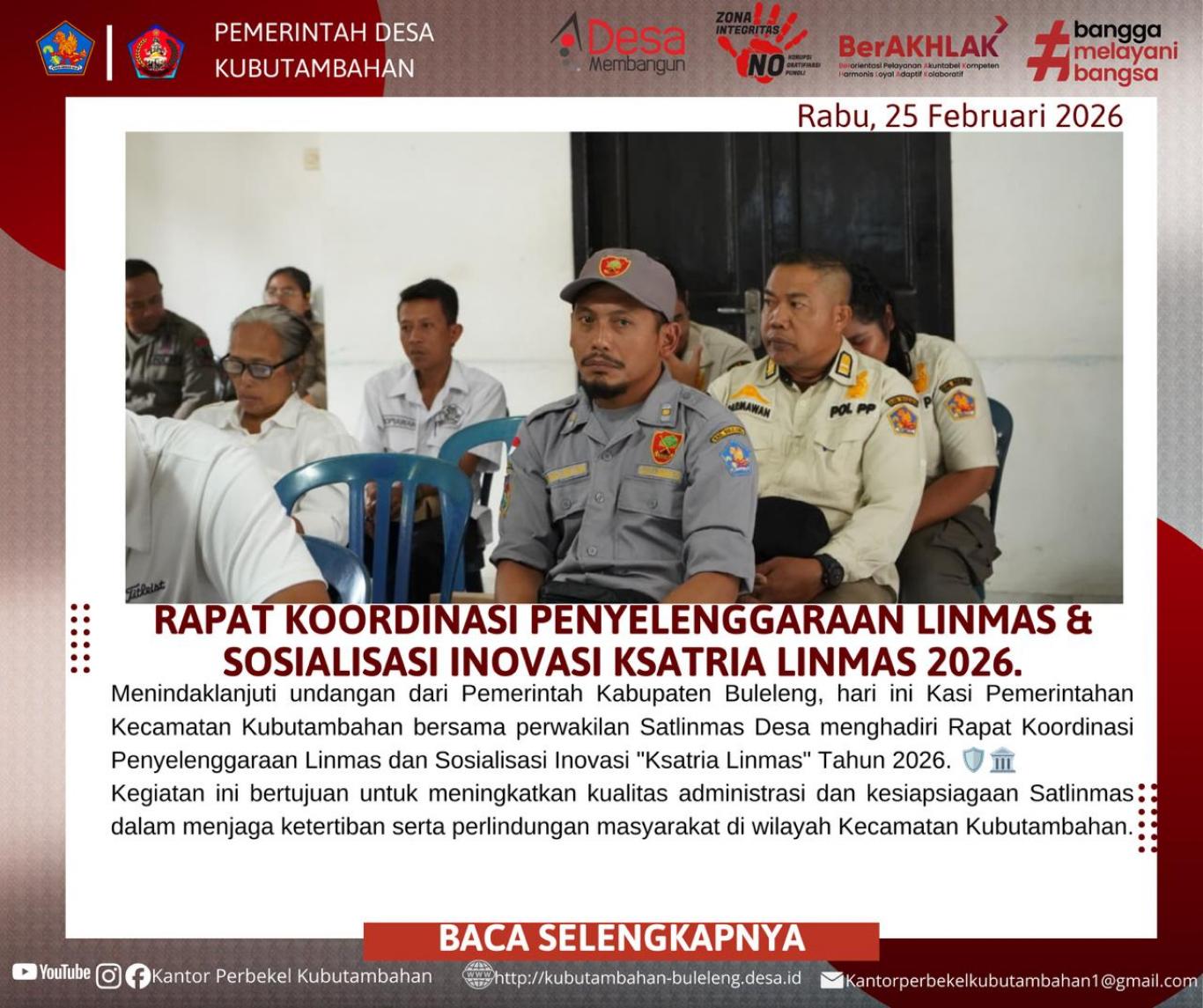KUBUTAMBAHAN – Dalam upaya memperkuat sistem keamanan dan ketertiban di tingkat desa, Pemerintah Kecamatan Kubutambahan menggelar agenda penting pada Rabu, 25 Februari 2026. Kegiatan tersebut berupa Rapat Koordinasi Penyelenggaraan Linmas sekaligus Sosialisasi Inovasi "Ksatria Linmas" Tahun 2026.