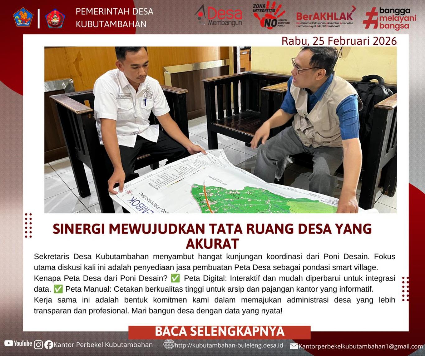 Kegiatan koordinasi ini merupakan wujud nyata dari semangat BerAKHLAK dan moto Bangga Melayani Bangsa yang diusung oleh Pemerintah Desa Kubutambahan. Melalui inovasi dan digitalisasi tata ruang, desa berkomitmen untuk terus maju di berbagai sektor demi kesejahteraan masyarakat.