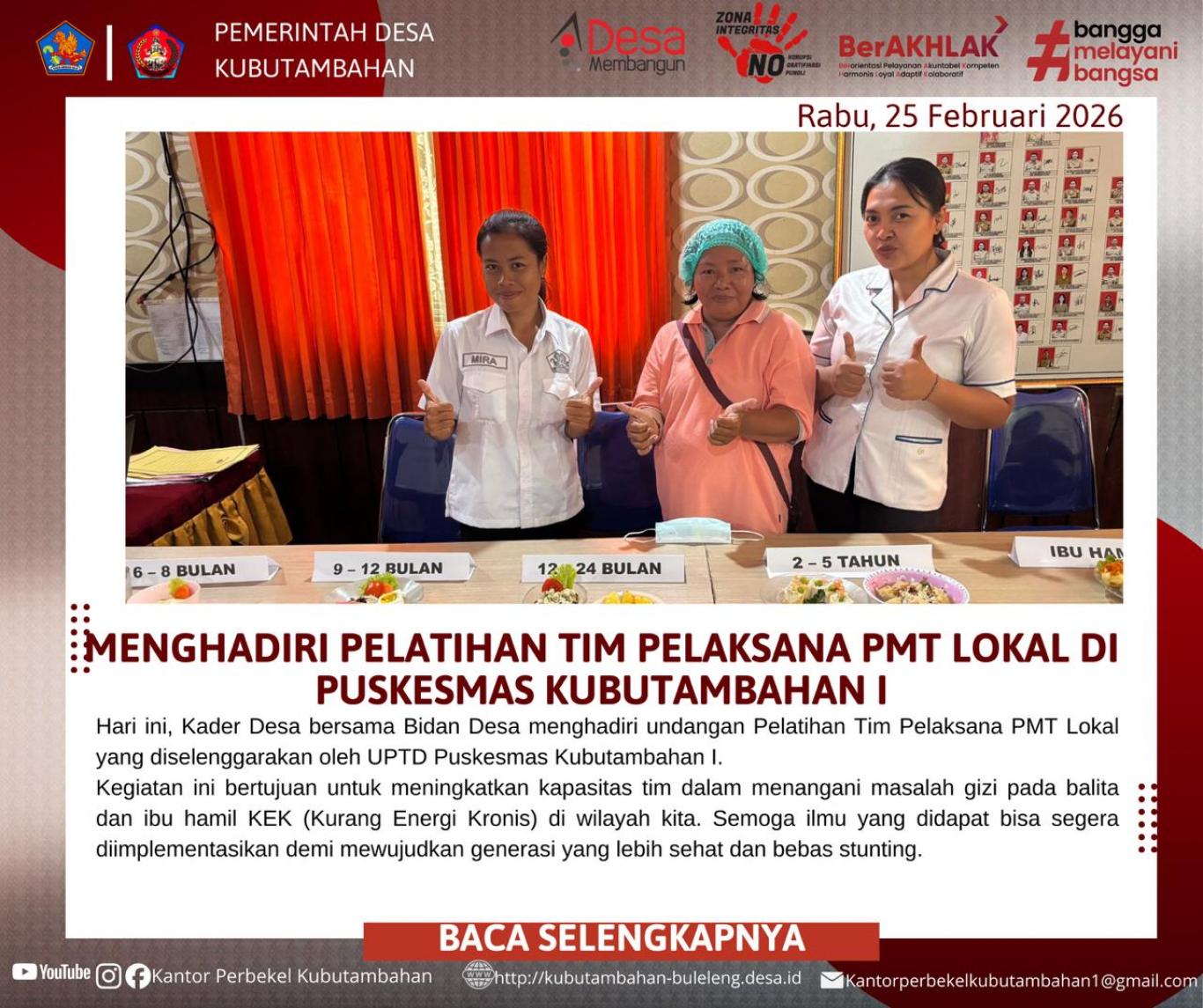 Di bidang kesehatan, Kader Desa bersama Bidan Desa menghadiri undangan pelatihan Tim Pelaksana Pemberian Makanan Tambahan (PMT) Lokal yang diselenggarakan oleh UPTD Puskesmas Kubutambahan I. Kegiatan ini menjadi langkah konkret desa dalam memperkuat garda terdepan penanganan gizi di wilayah tersebut.