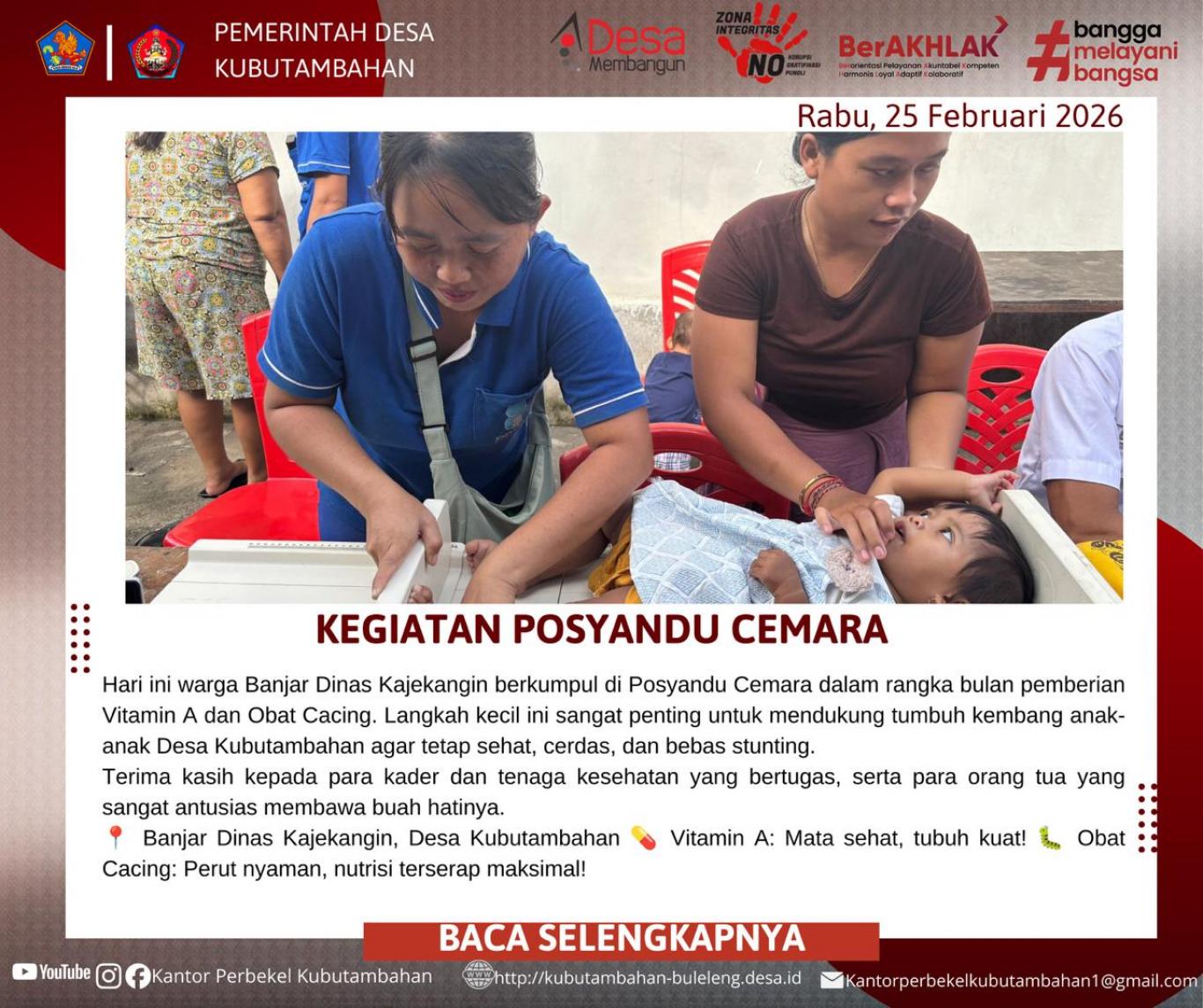 KUBUTAMBAHAN – Pelayanan kesehatan dasar berbasis masyarakat kembali dilaksanakan secara optimal di wilayah Desa Kubutambahan. Pada hari ini Rabu, 25 Pebruari 2026, telah berlangsung kegiatan POSYANDU CEMARA yang bertempat di Banjar Dinas Kajekangin