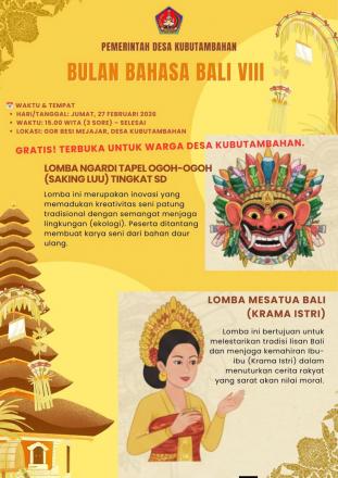 KUBUTAMBAHAN – Pemerintah Desa Kubutambahan kembali menunjukkan komitmennya dalam menjaga akar budaya lokal melalui penyelenggaraan Bulan Bahasa Bali VIII. Kegiatan ini dijadwalkan berlangsung pada hari Jumat, 27 Februari 2026, bertempat di GOR Besi Mejajar, Desa Kubutambahan. Acara akan dimulai pukul 15.00 WITA hingga selesai.