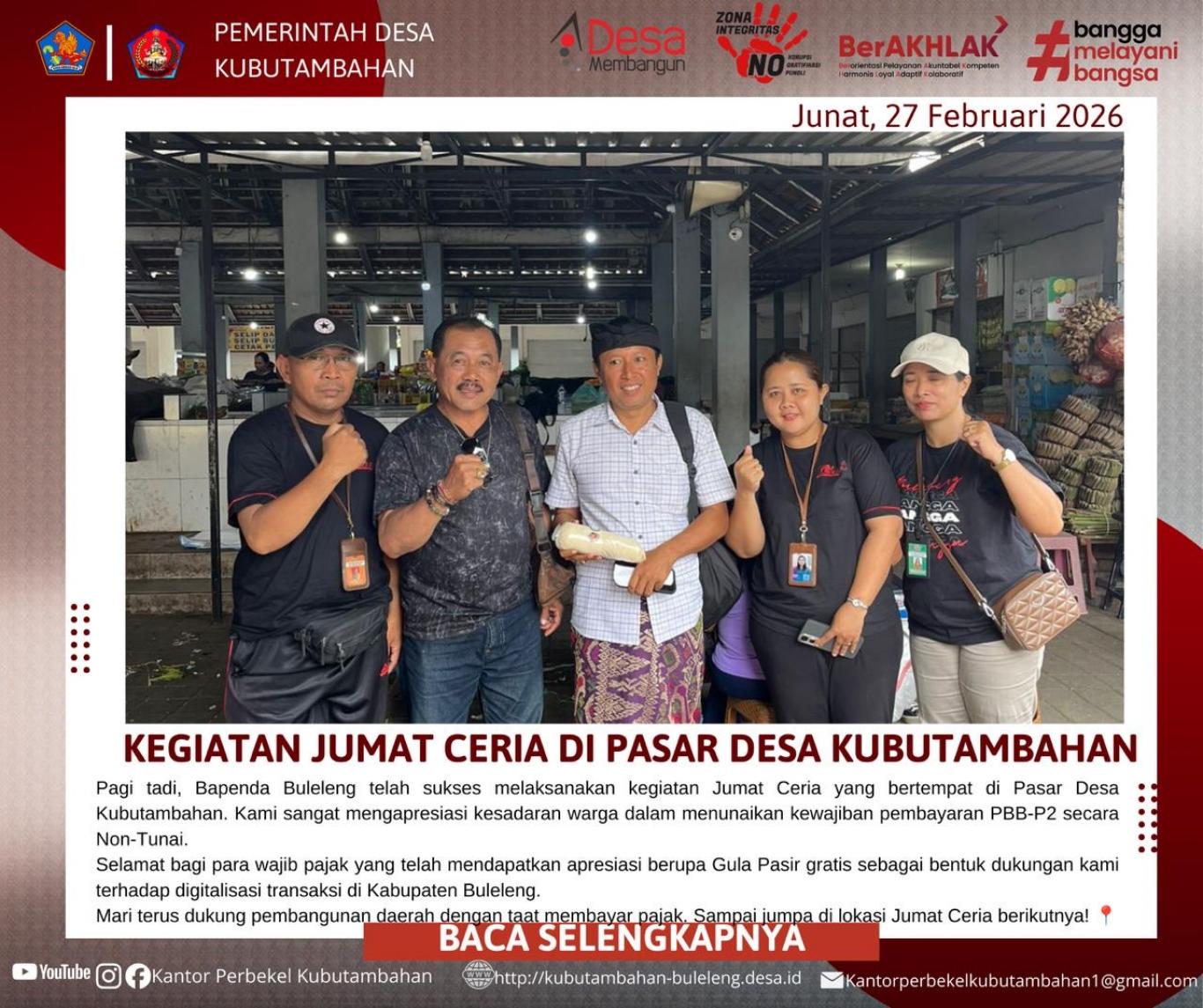 KUBUTAMBAHAN – Transformasi digital dalam sektor perpajakan daerah terus digencarkan oleh Pemerintah Kabupaten Buleleng. Pada Jumat pagi, 27 Februari 2026, Badan Pendapatan Daerah (Bapenda) Kabupaten Buleleng sukses menyelenggarakan kegiatan "Jumat Ceria" yang dipusatkan di Pasar Desa Kubutambahan.