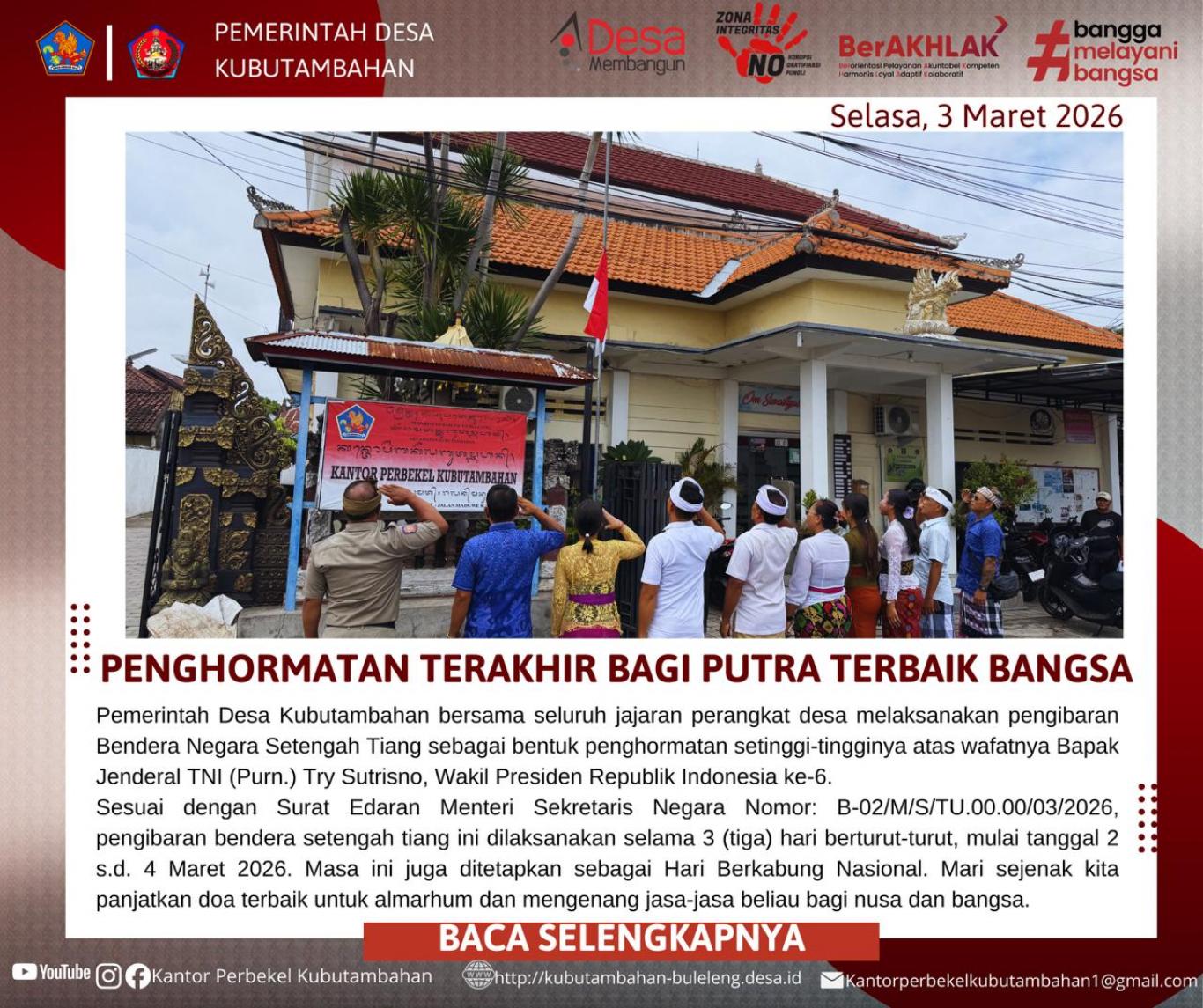 KUBUTAMBAHAN – Suasana khidmat menyelimuti Kantor Perbekel Kubutambahan pada Selasa, 3 Maret 2026. Pemerintah Desa Kubutambahan beserta seluruh jajaran perangkat desa melaksanakan upacara pengibaran Bendera Negara Setengah Tiang. Aksi ini merupakan bentuk penghormatan setinggi-tingginya atas wafatnya salah satu putra terbaik bangsa, Bapak Jenderal TNI (Purn.) Try Sutrisno, Wakil Presiden Republik Indonesia ke-6.