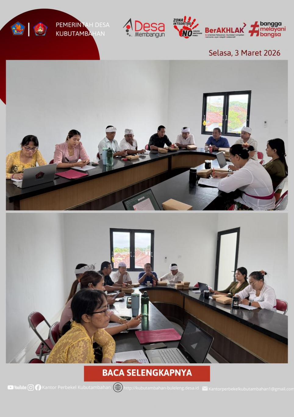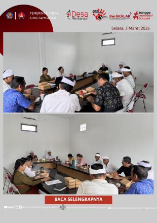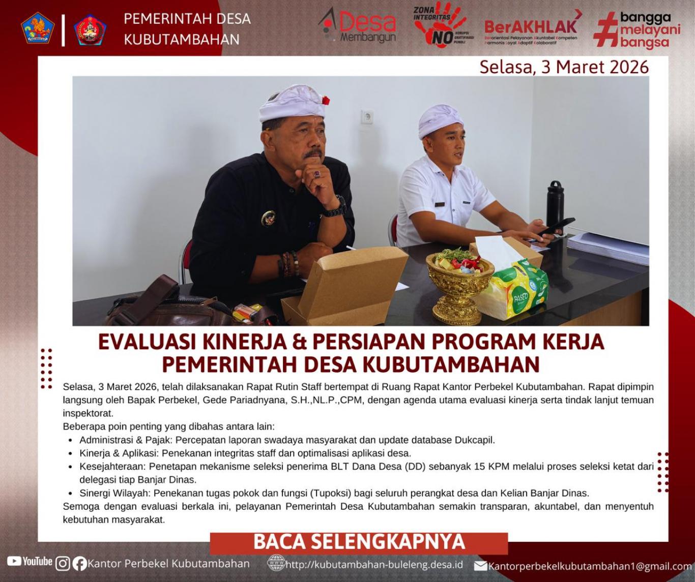 KUBUTAMBAHAN – Dalam upaya memperkuat tata kelola pemerintahan desa yang transparan dan akuntabel, Pemerintah Desa Kubutambahan menyelenggarakan Rapat Rutin Staf pada Selasa, 3 Maret 2026. Bertempat di Ruang Rapat Kantor Perbekel Kubutambahan, rapat dipimpin langsung oleh Perbekel Kubutambahan, Gede Pariadnyana, S.H., NL.P., CPM., didampingi Sekretaris Desa, Kadek Agus Sugiartana.