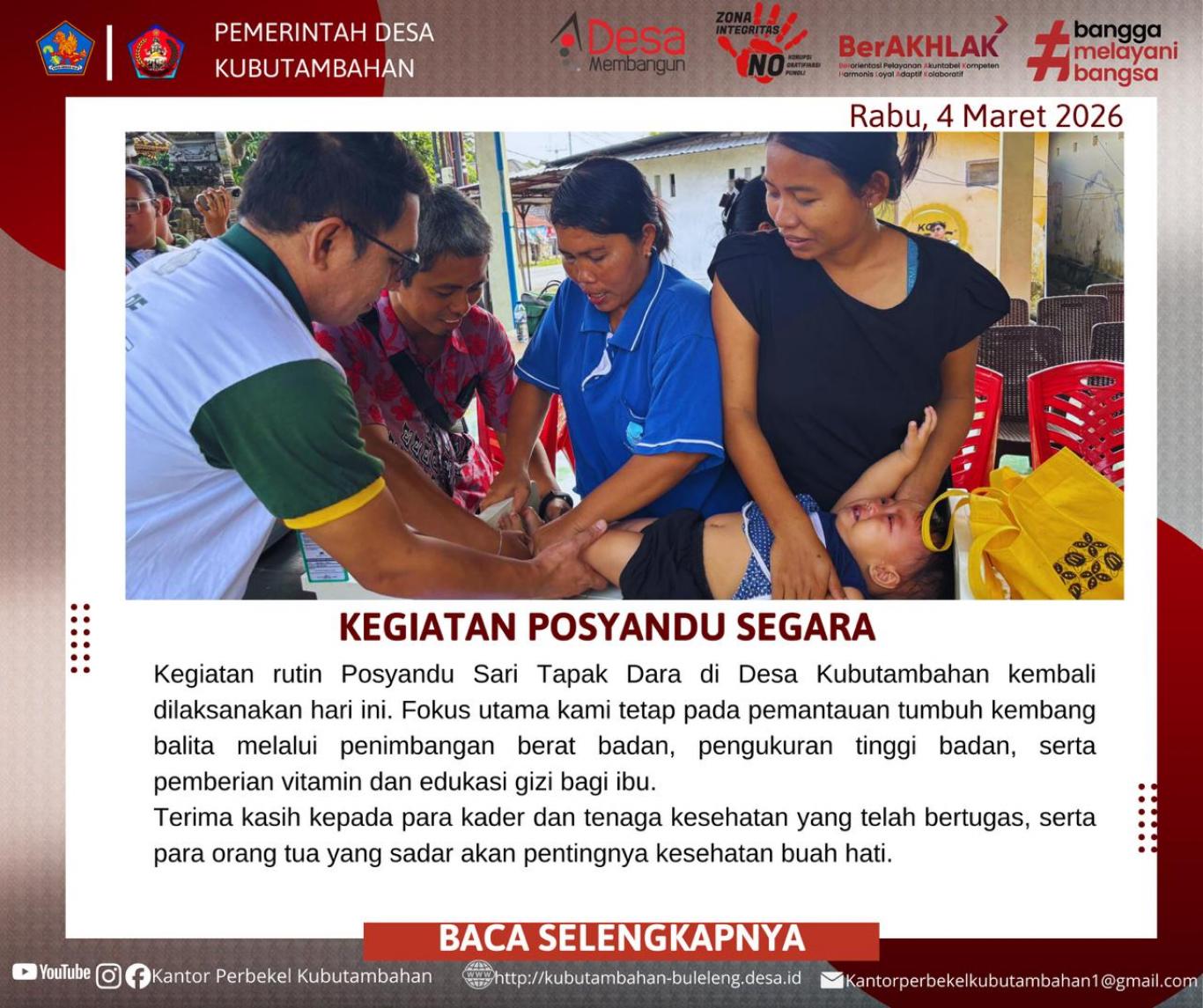 KUBUTAMBAHAN – Pemerintah Desa Kubutambahan kembali menunjukkan komitmennya dalam meningkatkan kualitas kesehatan masyarakat, khususnya bagi generasi masa depan. Pada hari Rabu, 4 Maret 2026, kegiatan rutin Posyandu Sari Tapak Dara sukses dilaksanakan dengan antusiasme tinggi dari warga setempat.