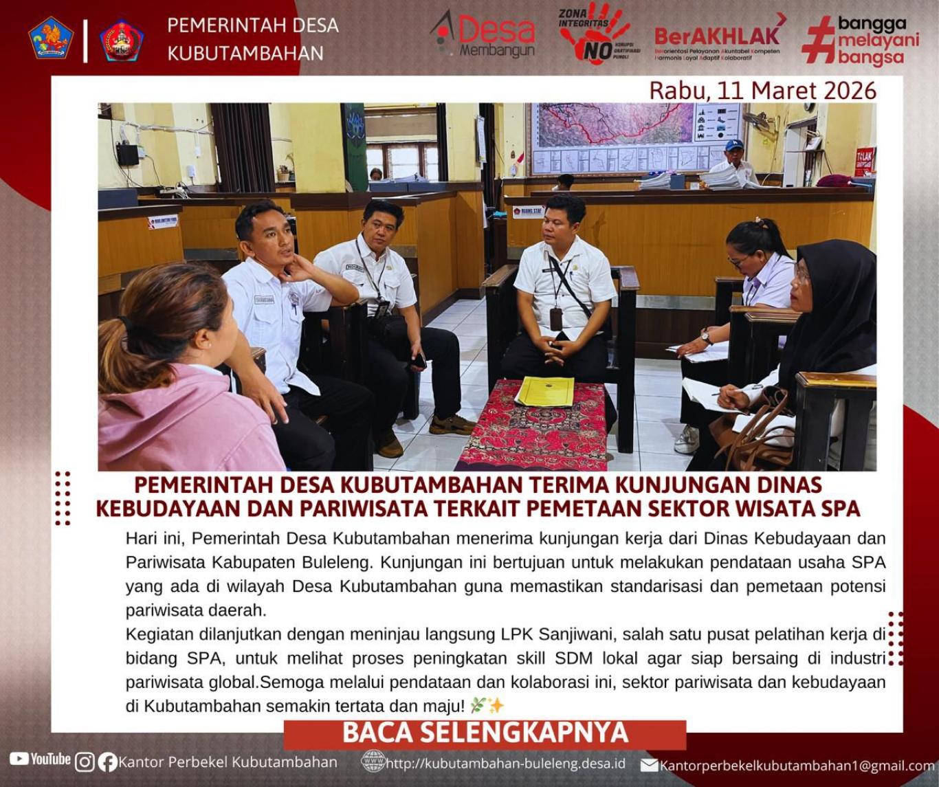 KUBUTAMBAHAN – Dalam upaya mendorong pengembangan potensi pariwisata daerah, Pemerintah Desa Kubutambahan menerima kunjungan kerja dari Dinas Kebudayaan dan Pariwisata Kabupaten Buleleng pada Rabu, 11 Maret 2026.