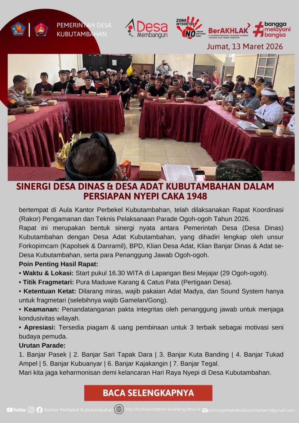 - SINERGI DESA ADAT DAN DESA DINAS KUBUTAMBAHAN DALAM RANGKA PERSIAPAN HARI RAYA NYEPI TAHUN SAKA 1948