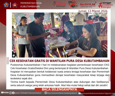 KUBUTAMBAHAN – Kesehatan masyarakat menjadi prioritas utama bagi Pemerintah Desa Kubutambahan. Bekerja sama dengan Puskesmas Kubutambahan I, kegiatan pemeriksaan kesehatan gratis atau Deteksi Dini (CKG) sukses dilaksanakan pada Jumat (13/03/2026).