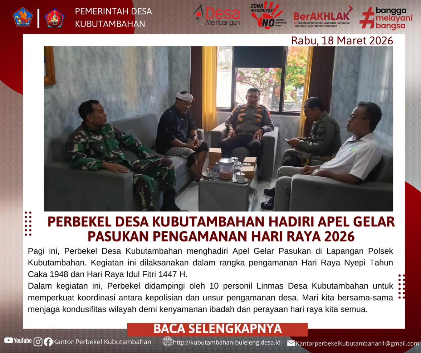 KUBUTAMBAHAN – Menjelang perayaan hari besar keagamaan yang berdekatan, Perbekel Desa Kubutambahan menghadiri kegiatan Apel Gelar Pasukan yang dilaksanakan di Lapangan Polsek Kubutambahan pada Rabu, 18 Maret 2026.