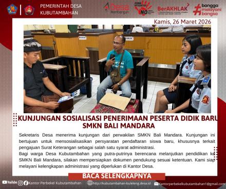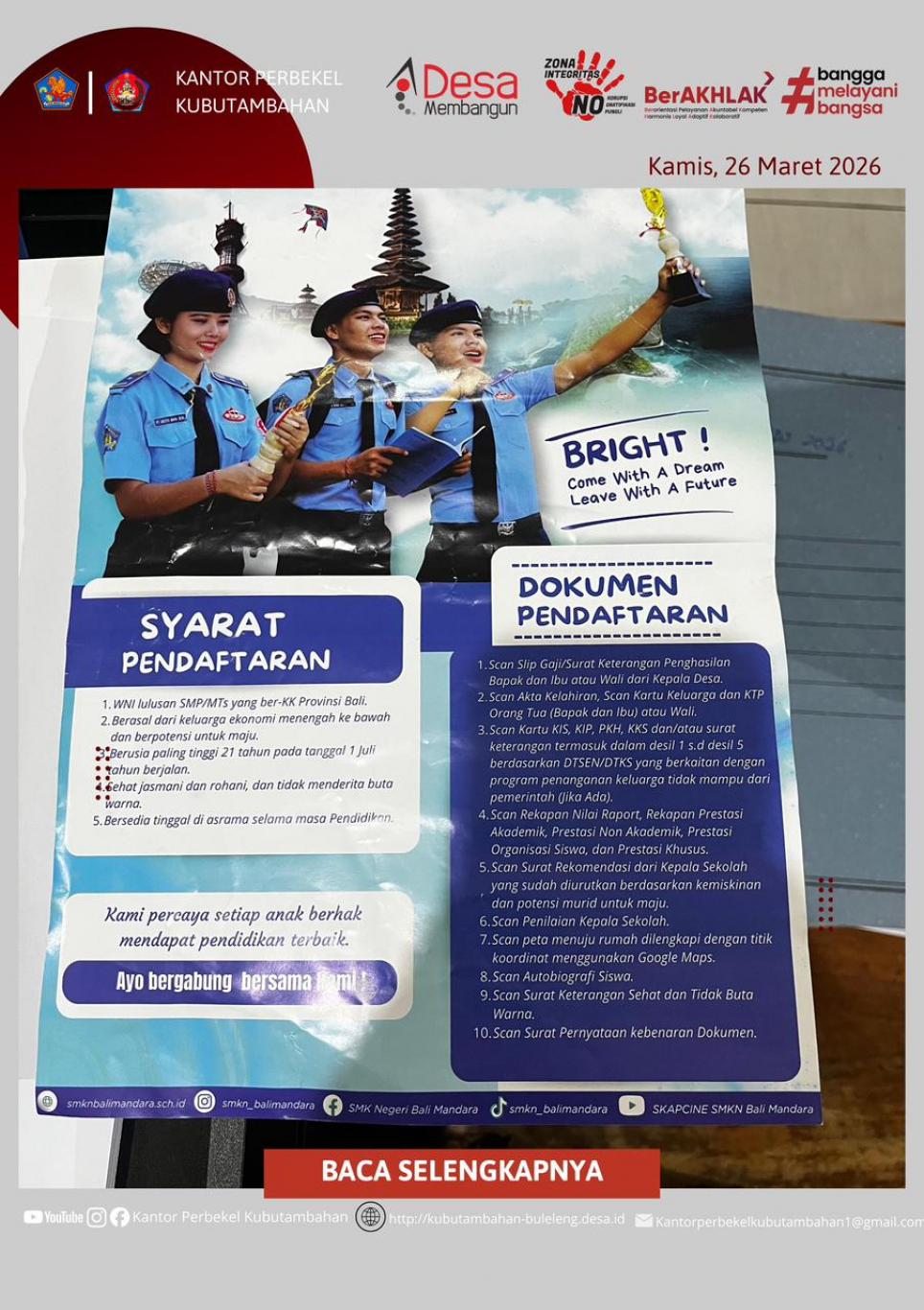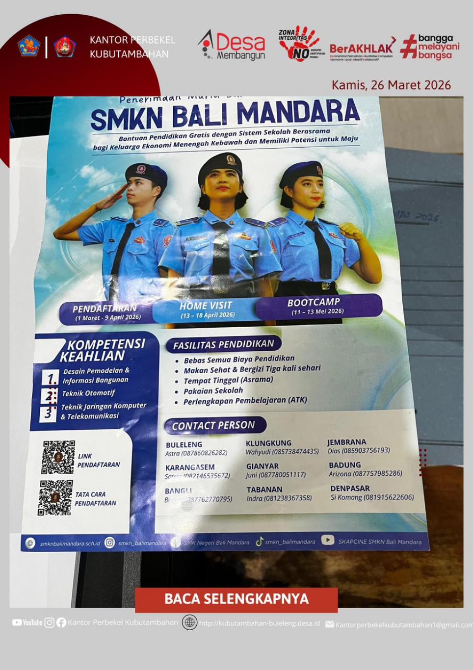 Bagi Bapak/Ibu warga Desa Kubutambahan yang putra-putrinya berencana melanjutkan pendidikan ke SMKN Bali Mandara, diharapkan segera mempersiapkan dokumen pendukung sesuai ketentuan yang berlaku. Informasi lebih lanjut dapat diperoleh langsung dengan datang ke Kantor Desa Kubutambahan pada jam kerja.