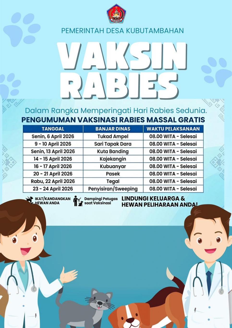 Kegiatan ini akan berlangsung sepanjang bulan April 2026 dengan menyasar berbagai Banjar Dinas. Mengingat pentingnya pencegahan rabies bagi kesehatan manusia dan hewan, partisipasi aktif warga sangat diharapkan.