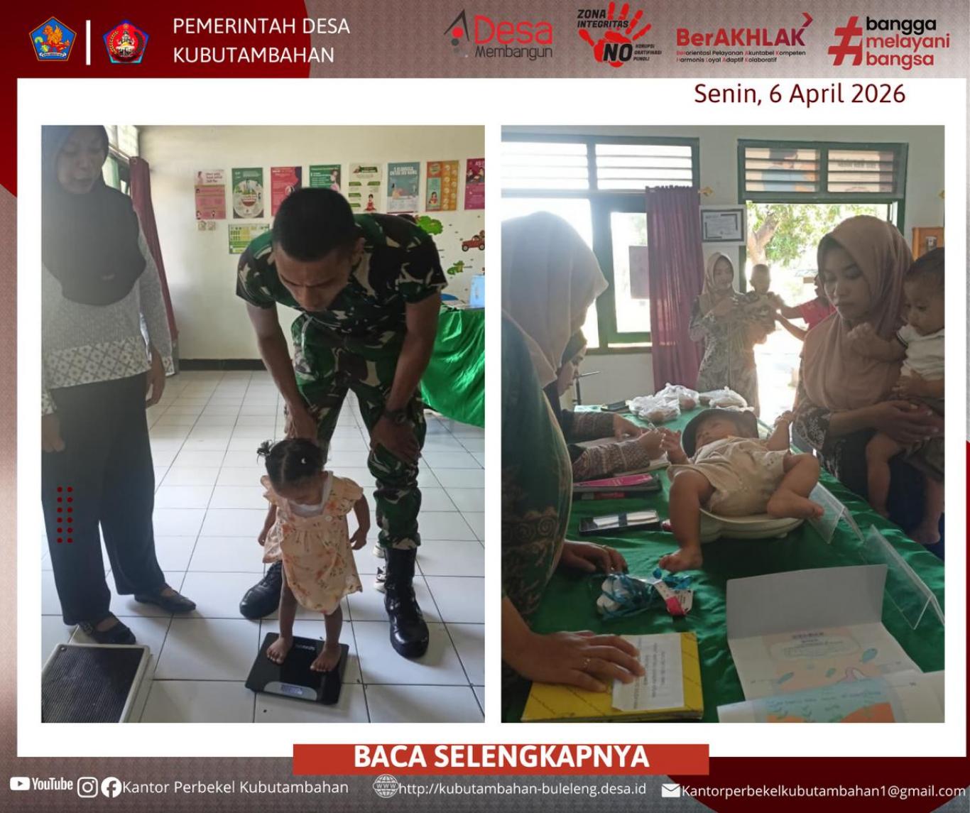 KUBUTAMBAHAN – Kesehatan ibu dan anak tetap menjadi prioritas utama Pemerintah Desa Kubutambahan. Pada hari ini, Senin (6/4), telah dilaksanakan kegiatan rutin bulanan Posyandu Kamboja Kompi B yang bertempat di lingkungan asrama Kompi B Yonif 900/SBW.