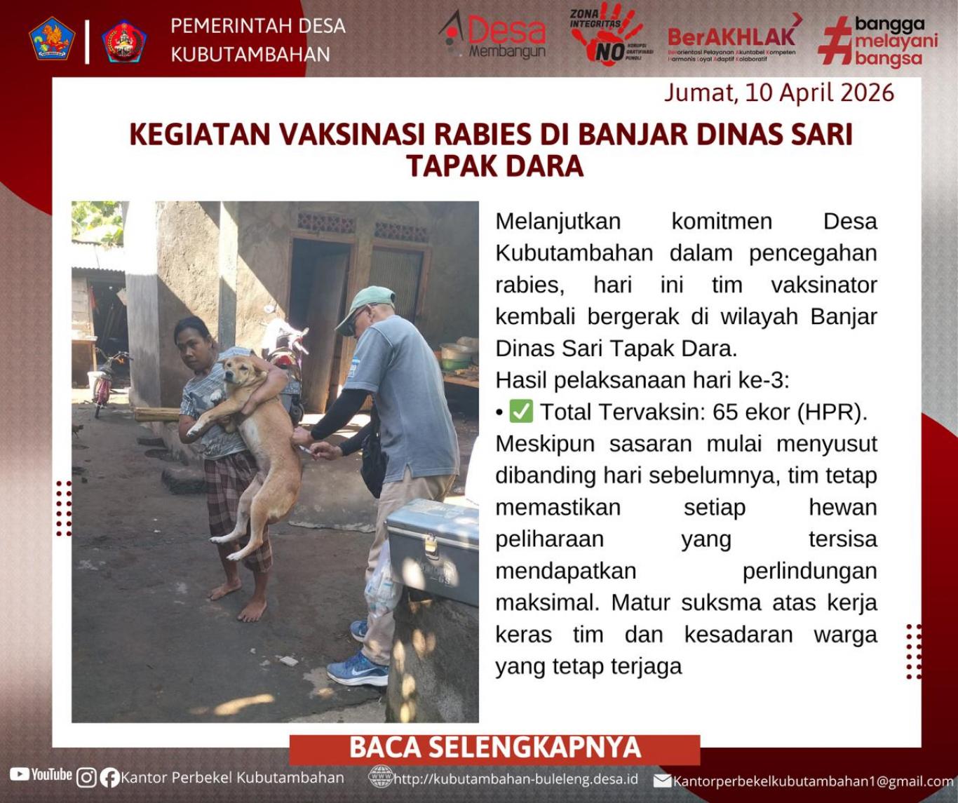 KUBUTAMBAHAN – Pemerintah Desa Kubutambahan terus menunjukkan komitmen serius dalam melindungi warga dan hewan peliharaan dari ancaman virus rabies. Pada hari Jumat, 10 April 2026, kegiatan vaksinasi rabies massal memasuki hari ketiga dengan menyasar wilayah Banjar Dinas Sari Tapak Dara.