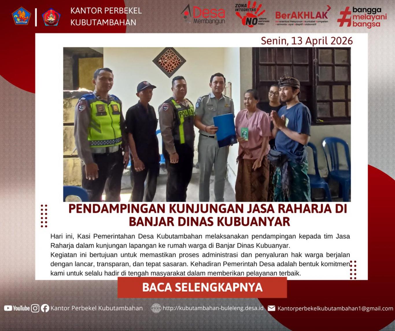 KUBUTAMBAHAN – Sebagai wujud nyata komitmen pelayanan prima dan kepedulian terhadap masyarakat, Pemerintah Desa Kubutambahan melaksanakan pendampingan khusus dalam kunjungan lapangan tim Jasa Raharja ke rumah salah satu warga di wilayah Banjar Dinas Kubuanyar pada Senin, 13 April 2026.