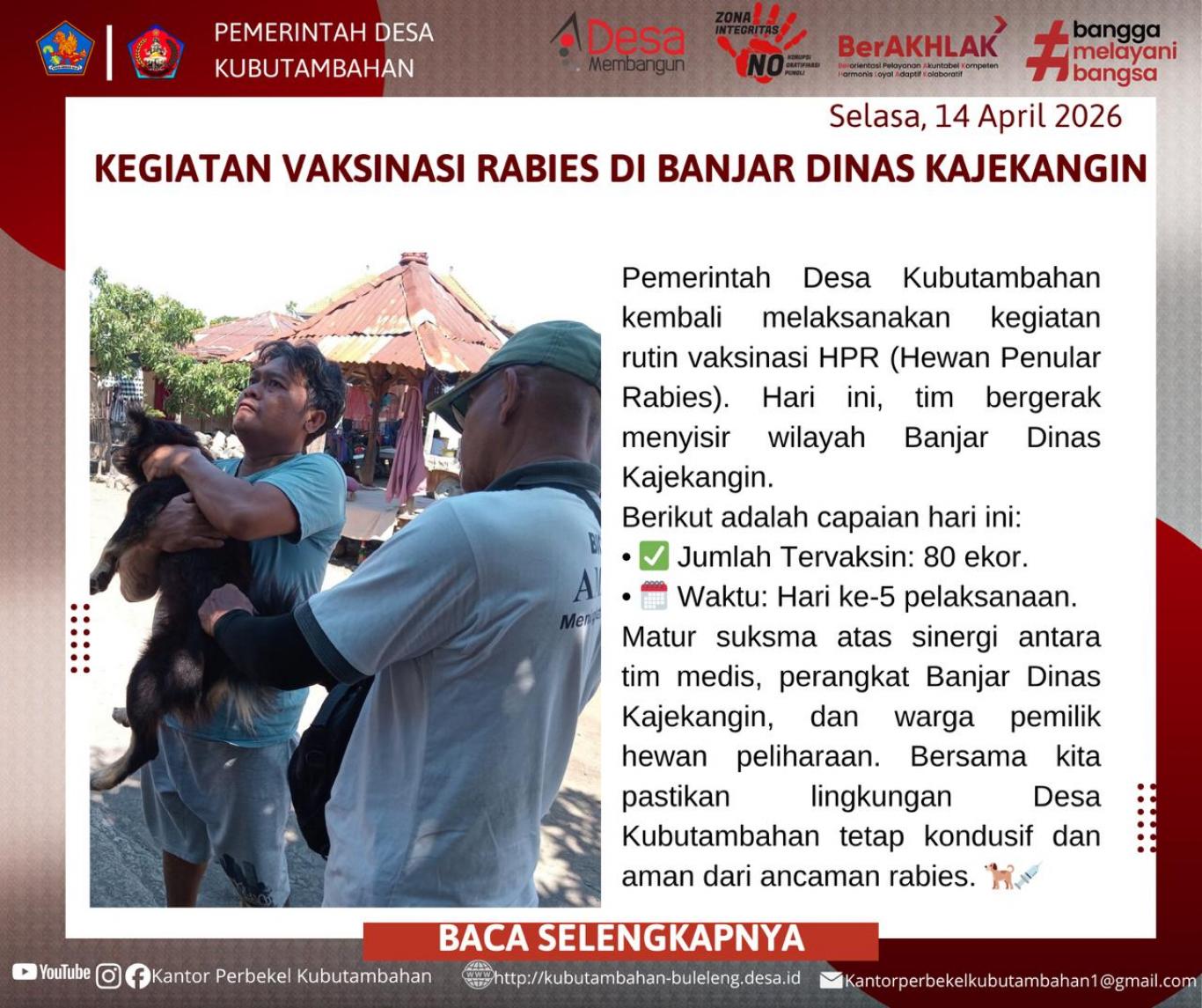KUBUTAMBAHAN – Pemerintah Desa Kubutambahan terus berkomitmen menjaga kesehatan masyarakat dan hewan peliharaan dari ancaman virus rabies. Pada hari Selasa, 14 April 2026, tim pelaksana kembali turun ke lapangan untuk melaksanakan kegiatan rutin vaksinasi HPR (Hewan Penular Rabies) yang berlokasi di wilayah Banjar Dinas Kajekangin.