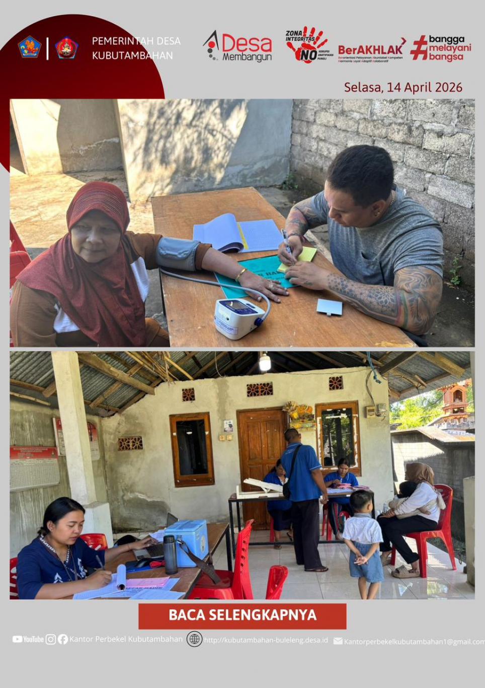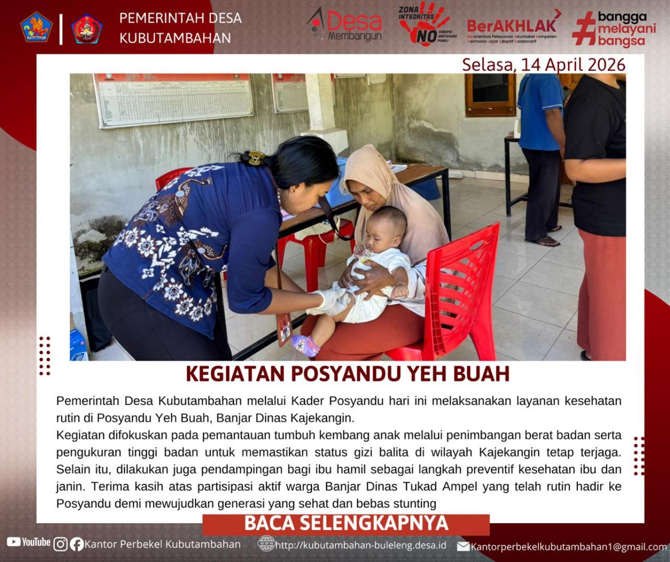 KUBUTAMBAHAN – Komitmen Pemerintah Desa Kubutambahan dalam menjaga kesehatan balita dan ibu hamil kembali diwujudkan melalui layanan kesehatan rutin. Pada hari Selasa, 14 April 2026, para Kader Posyandu melaksanakan kegiatan pelayanan kesehatan terpadu di Posyandu Yeh Buah, wilayah Banjar Dinas Kajekangin.