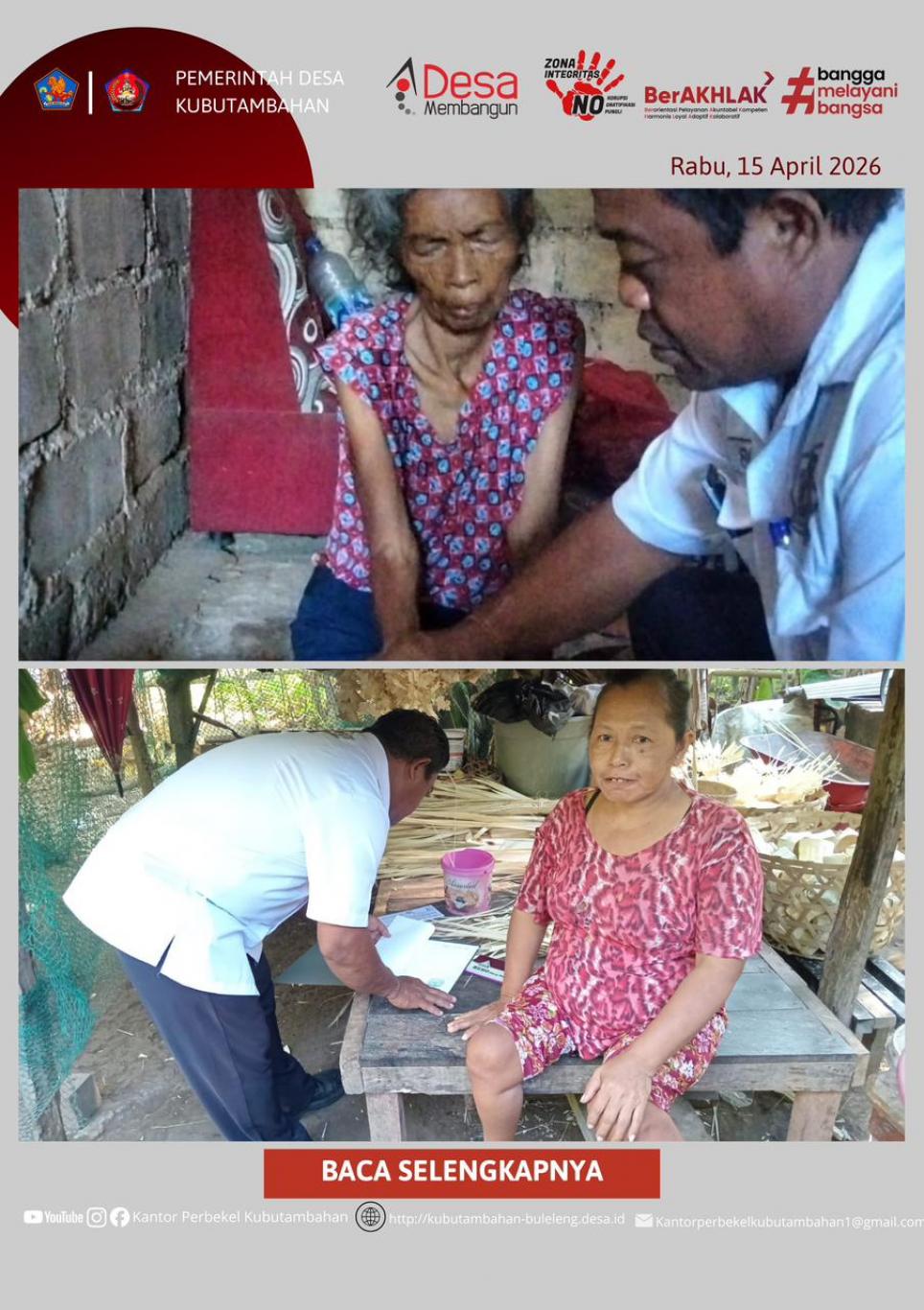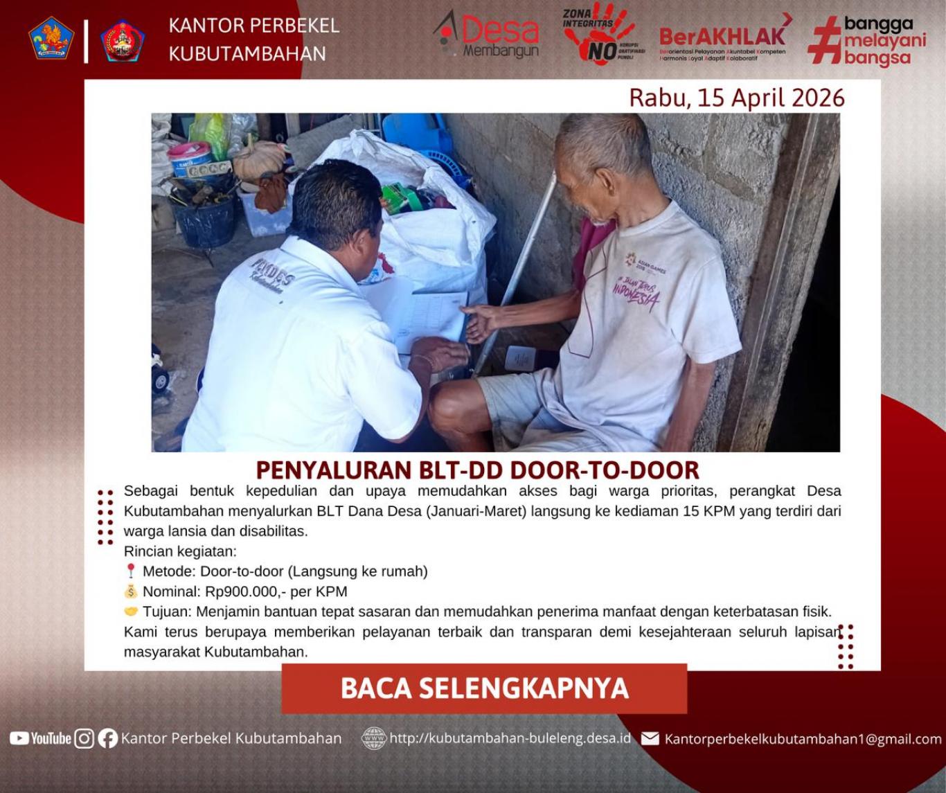 KUBUTAMBAHAN – Sebagai upaya nyata dalam memberikan pelayanan prima dan memastikan bantuan sosial tepat sasaran, Pemerintah Desa (Pemdes) Kubutambahan melaksanakan penyaluran Bantuan Langsung Tunai Dana Desa (BLT-DD) dengan metode door-to-door atau langsung ke rumah warga pada Rabu, 15 April 2026.
