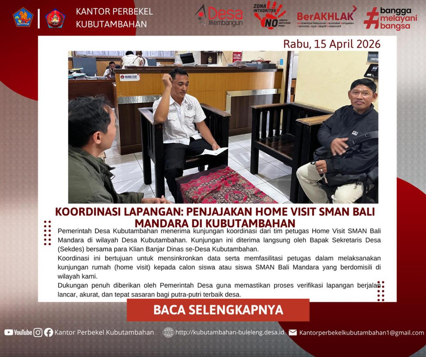 KUBUTAMBAHAN – Sinergi demi masa depan generasi muda terus diperkuat oleh Pemerintah Desa (Pemdes) Kubutambahan. Pada Rabu, 15 April 2026, Kantor Perbekel Kubutambahan menerima kunjungan koordinasi dari tim petugas Home Visit SMAN Bali Mandara.