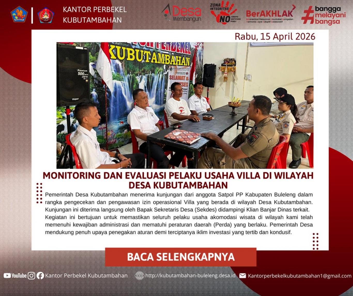 Kunjungan ini dilakukan dalam rangka monitoring dan evaluasi (monev) terhadap pelaku usaha akomodasi wisata, khususnya villa, yang beroperasi di wilayah hukum Desa Kubutambahan.
