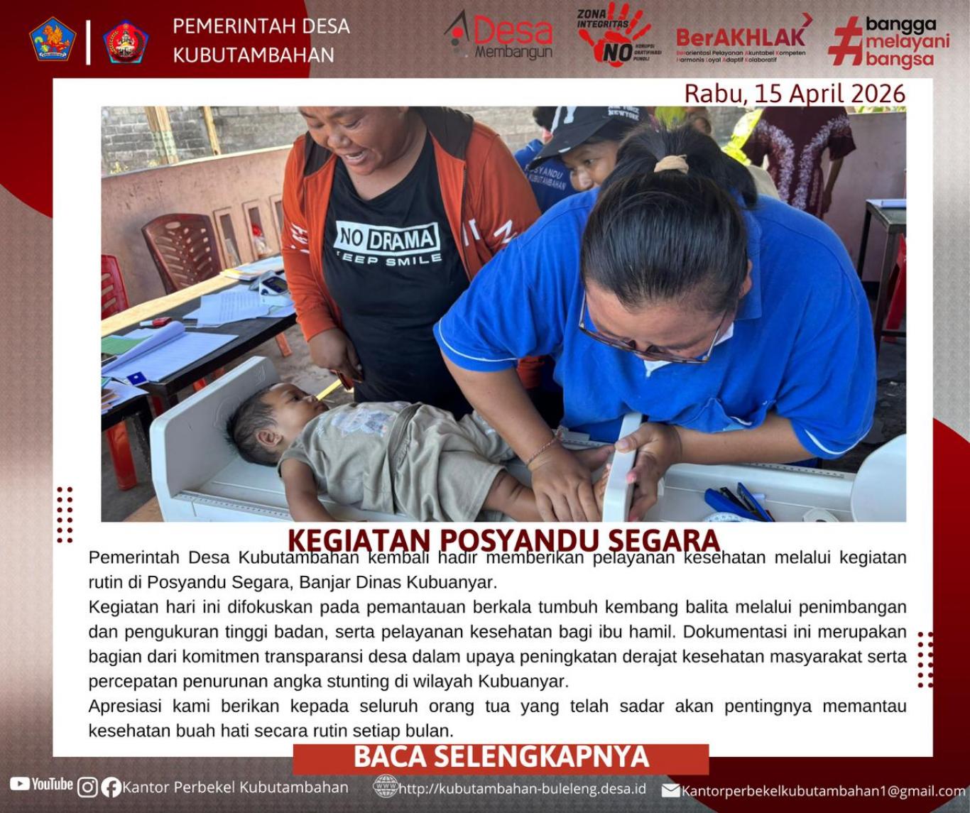 Pemerintah Desa Kubutambahan menekankan bahwa dokumentasi dan publikasi kegiatan ini merupakan bagian dari komitmen transparansi tata kelola desa. Melalui keterbukaan informasi, masyarakat dapat melihat langsung realisasi program-program kesehatan yang dijalankan oleh pemerintah desa.