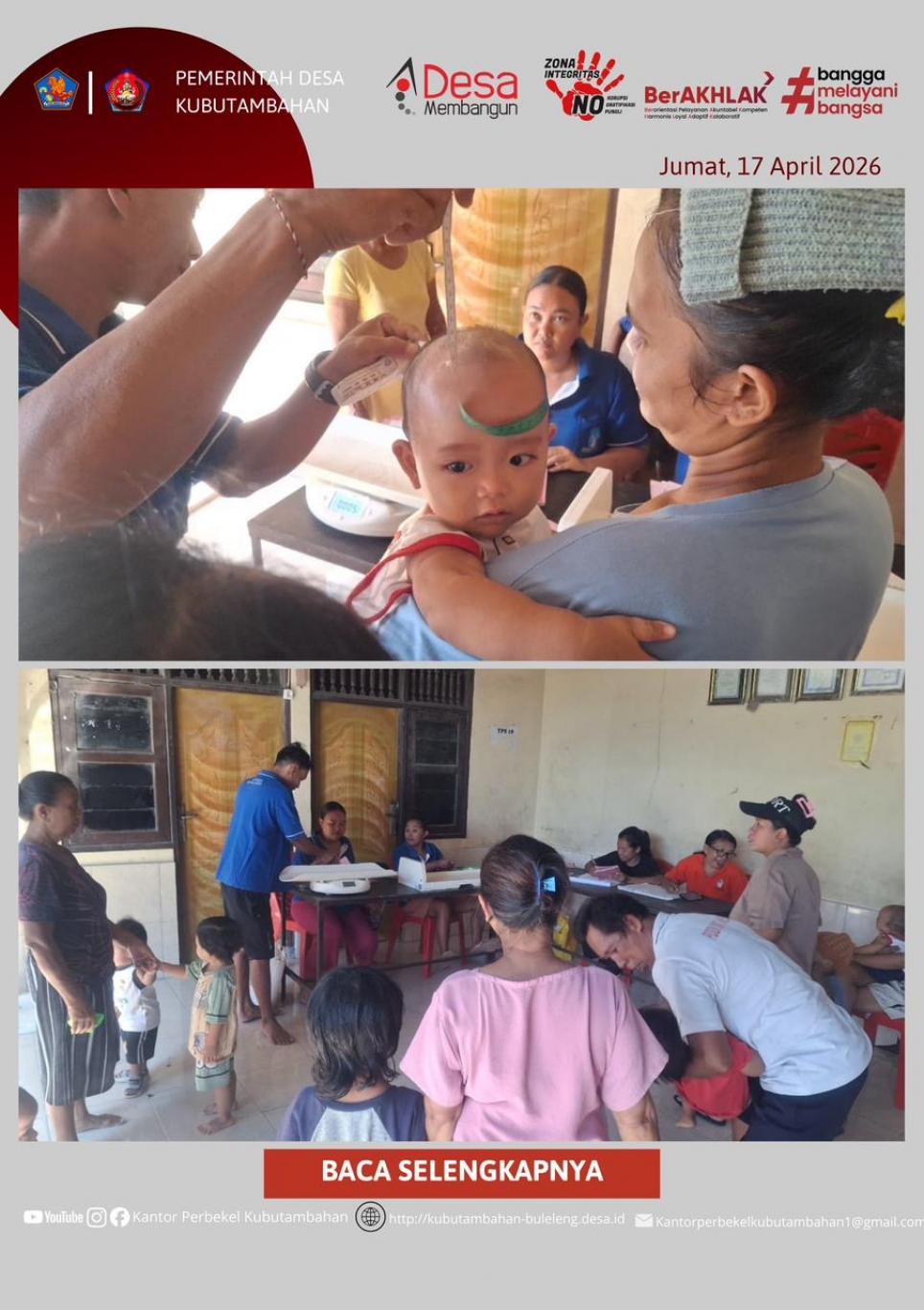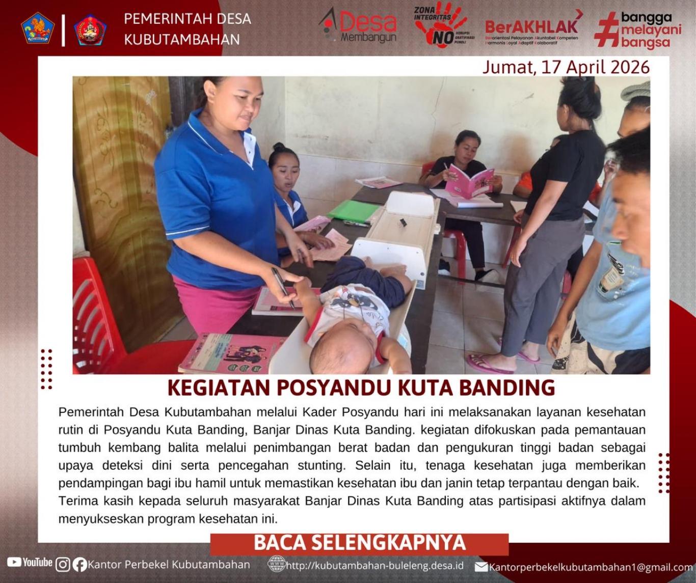 KUBUTAMBAHAN – Sebagai wujud nyata kepedulian terhadap kesehatan masyarakat, khususnya dalam upaya pencegahan stunting sejak dini, Pemerintah Desa Kubutambahan kembali melaksanakan kegiatan rutin Posyandu. Kali ini, kegiatan dipusatkan di Posyandu Kuta Banding, Banjar Dinas Kuta Banding, pada Jumat (17/04/2026).