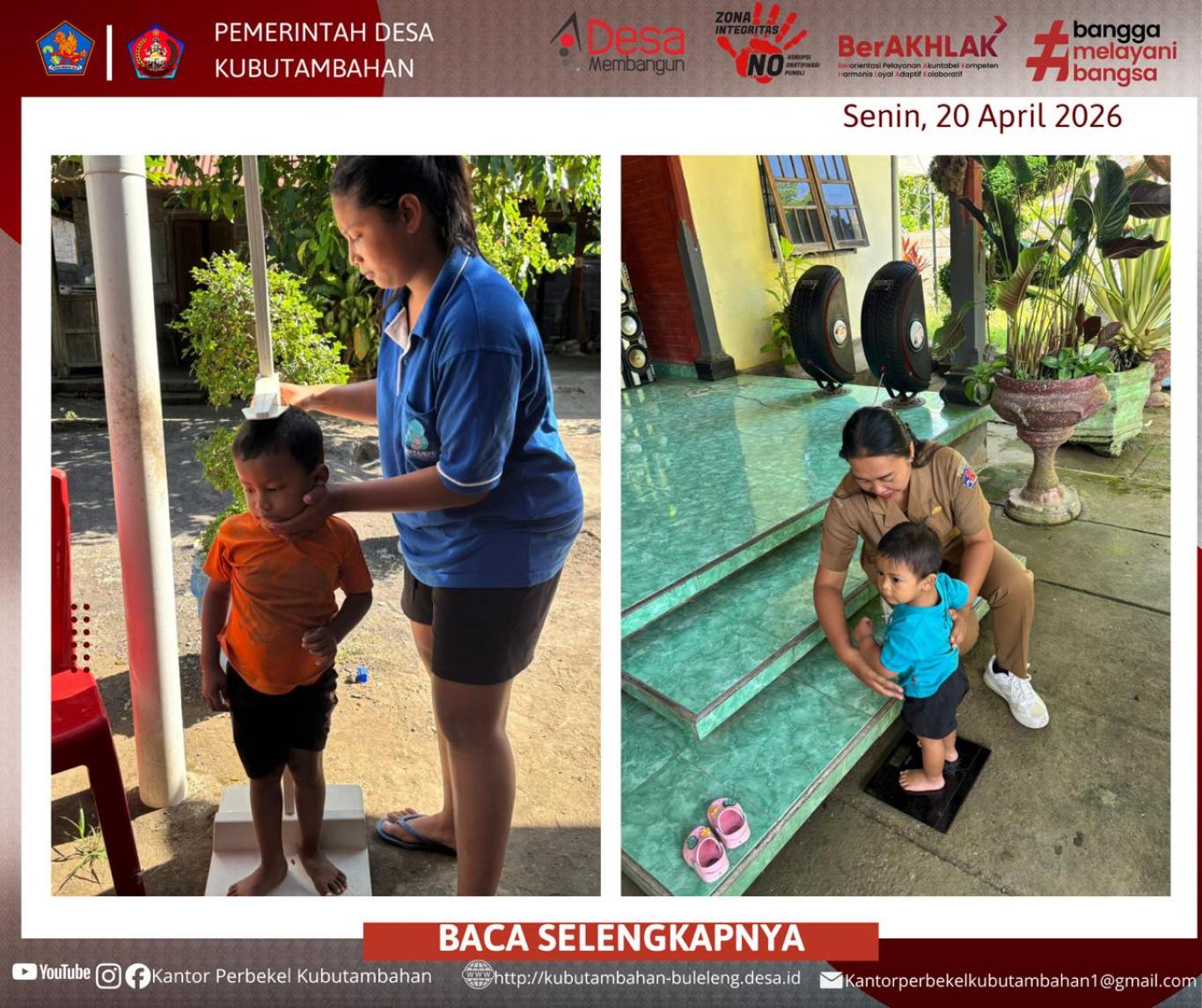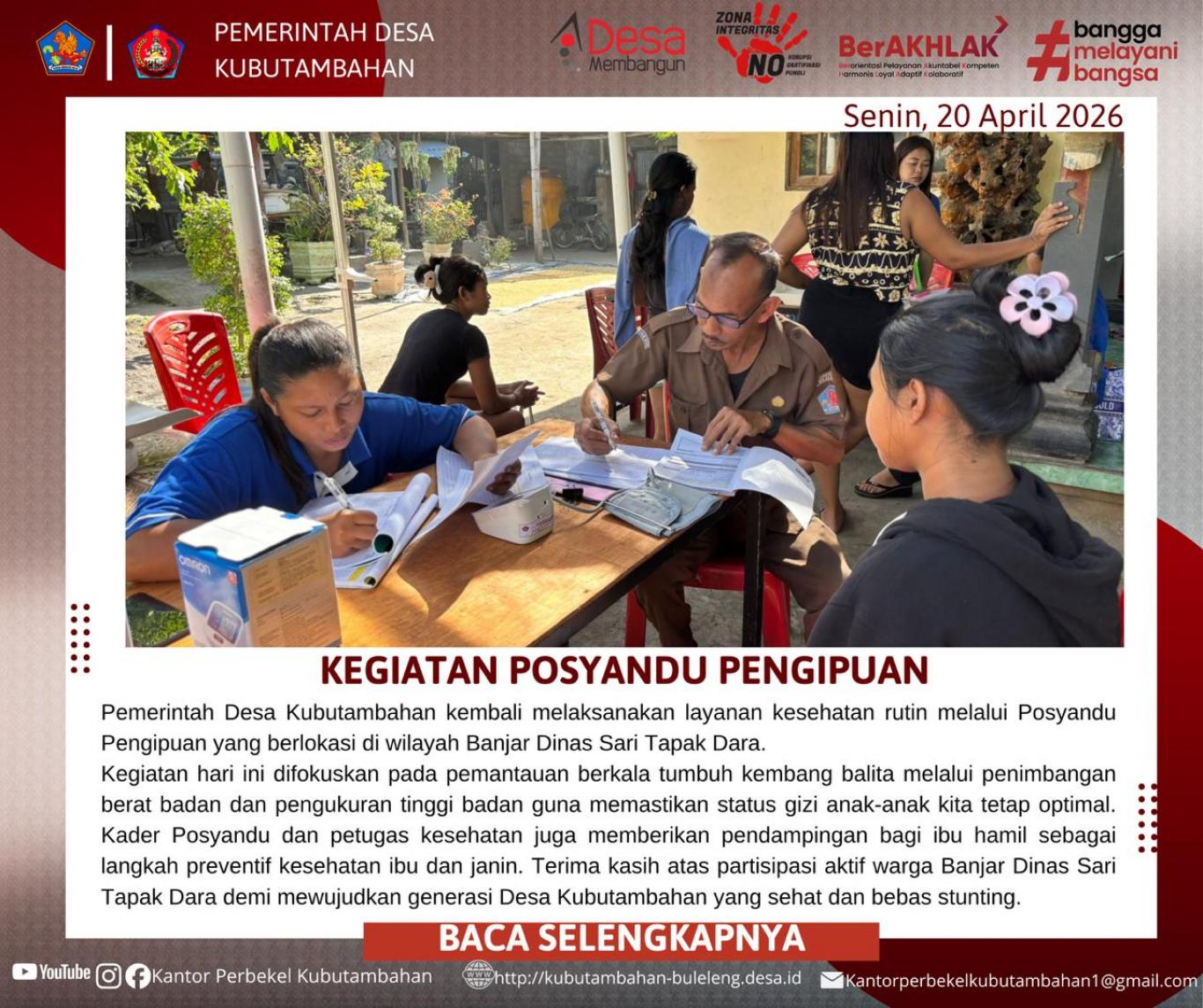 KUBUTAMBAHAN – Dalam rangka meningkatkan derajat kesehatan masyarakat dan menekan angka stunting, Pemerintah Desa Kubutambahan kembali melaksanakan kegiatan layanan kesehatan rutin melalui Posyandu Pengipuan. Kegiatan yang berlangsung pada Senin, 20 April 2026 ini dipusatkan di wilayah Banjar Dinas Sari Tapak Dara.