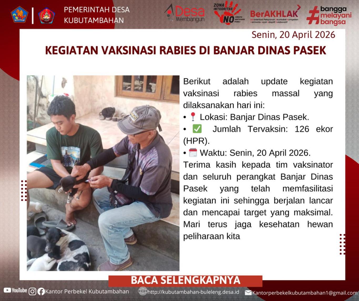 KUBUTAMBAHAN – Pemerintah Desa Kubutambahan terus menunjukkan komitmennya dalam menjaga kesehatan masyarakat dan hewan peliharaan. Pada hari ini, Senin, 20 April 2026, tim vaksinator resmi melaksanakan kegiatan vaksinasi rabies massal yang menyasar wilayah Banjar Dinas Pasek.