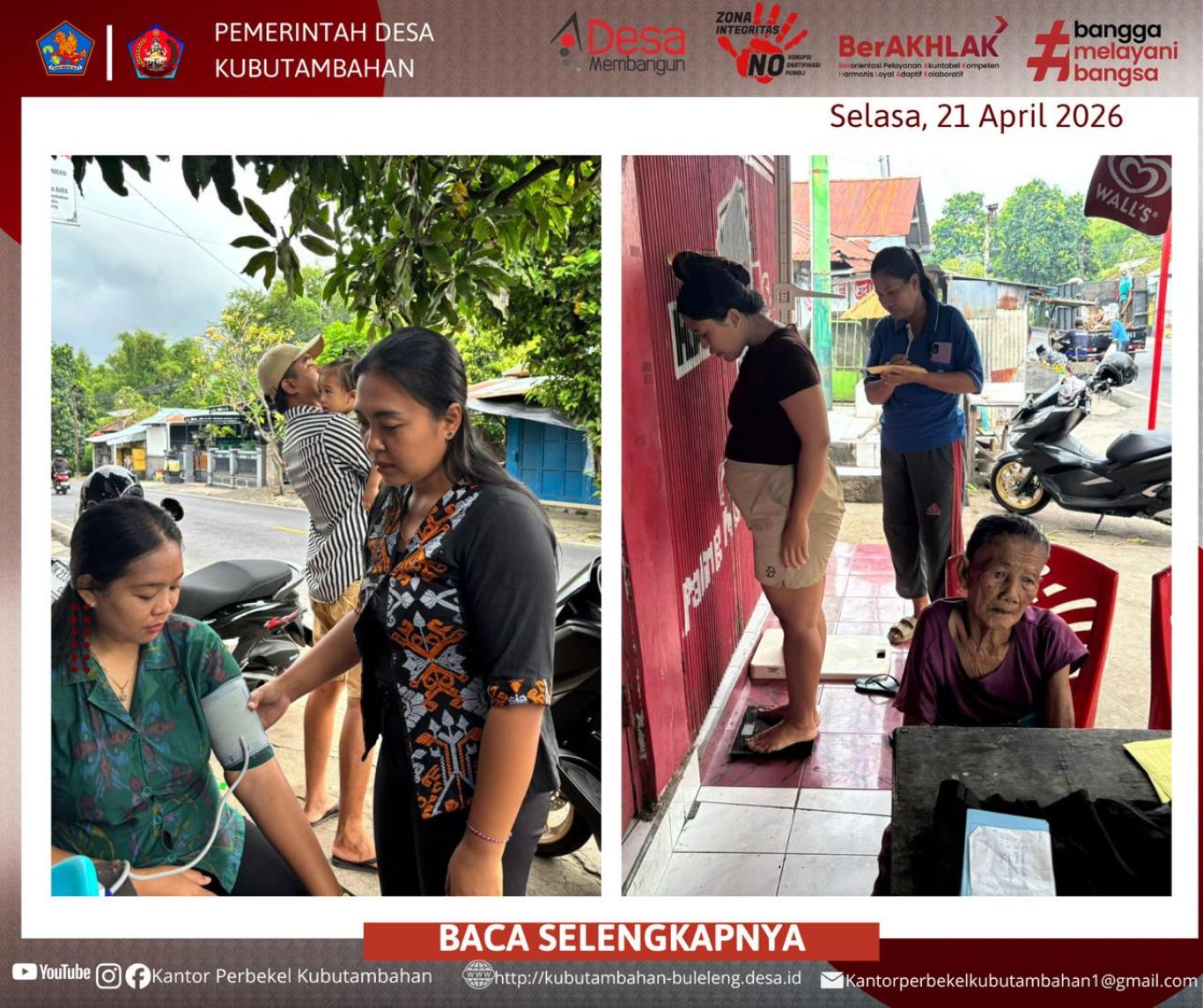 KUBUTAMBAHAN – Sebagai wujud komitmen dalam meningkatkan taraf kesehatan masyarakat, Pemerintah Desa Kubutambahan melalui Kader Posyandu kembali melaksanakan layanan kesehatan rutin. Kegiatan ini berlangsung pada Selasa, 21 April 2026, bertempat di Posyandu Cemara, Banjar Dinas Kajekangin.