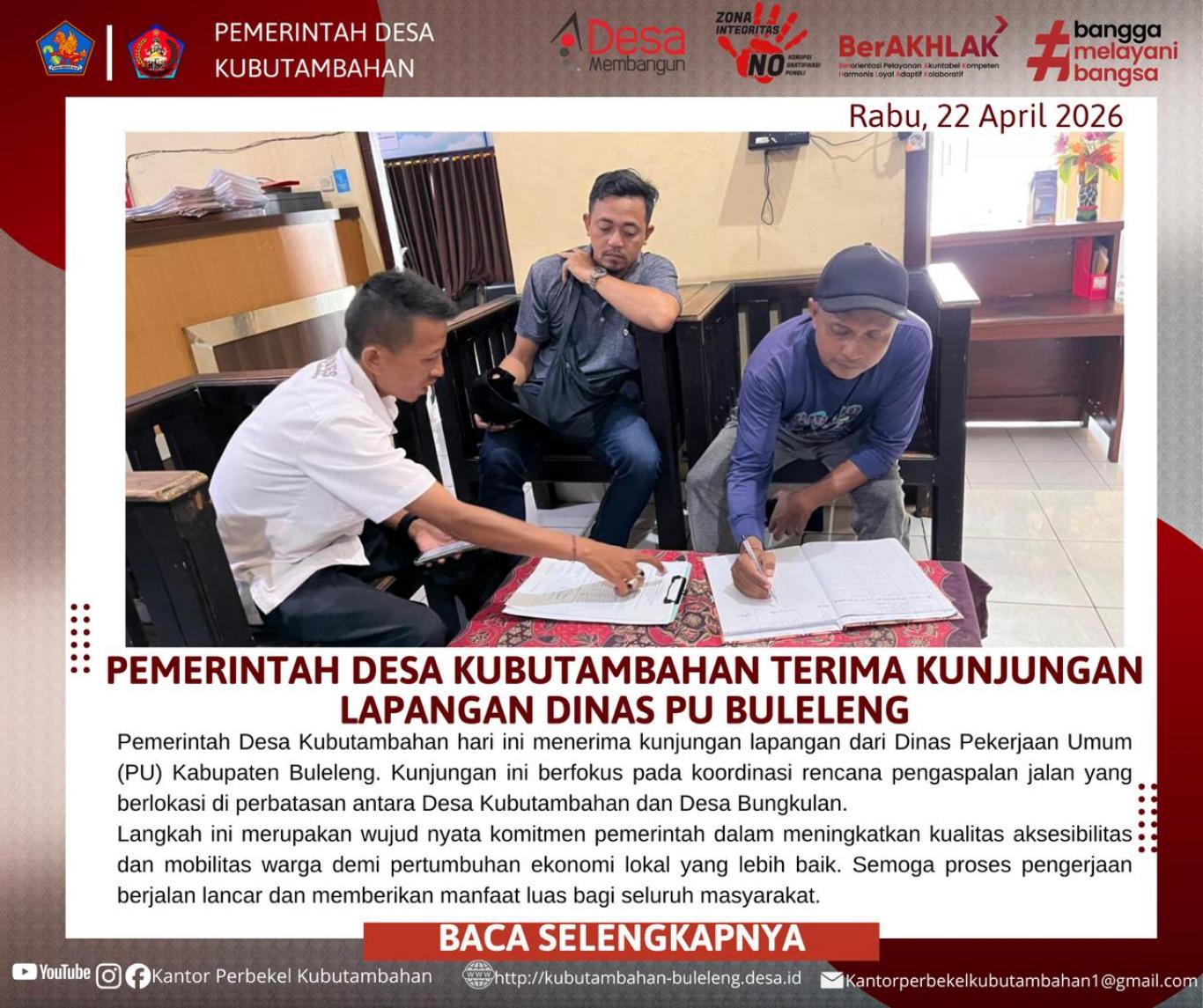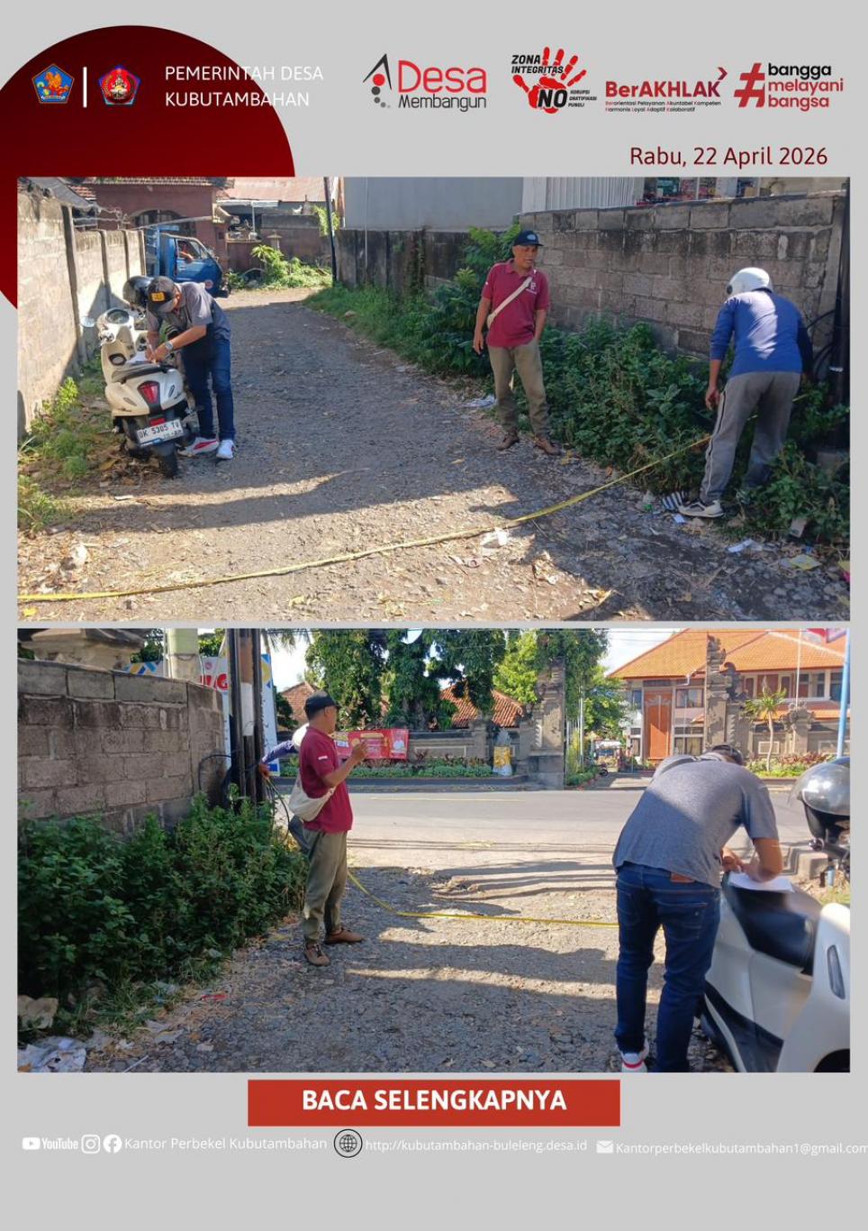 KUBUTAMBAHAN – Dalam upaya mewujudkan tata ruang desa yang lebih baik dan mendukung mobilitas warga, Pemerintah Desa Kubutambahan melaksanakan kegiatan survei dan pengukuran lapangan pada sebuah akses jalan pemukiman, Rabu (22/04/2026).