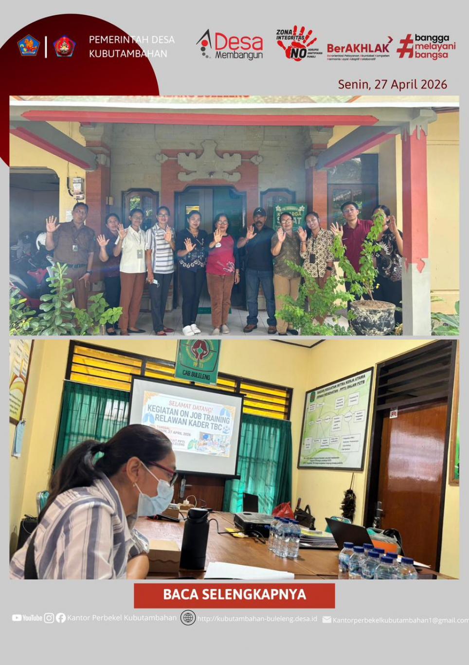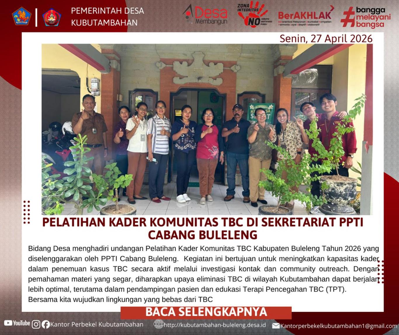 KUBUTAMBAHAN – Sebagai wujud komitmen dalam menjaga kesehatan masyarakat, Pemerintah Desa Kubutambahan melalui Bidang Desa menghadiri undangan Pelatihan Kader Komunitas TBC Kabupaten Buleleng Tahun 2026. Kegiatan ini dilaksanakan pada hari Senin, 27 April 2026, bertempat di Sekretariat Perhimpunan Pemberantasan Tuberkulosis Indonesia (PPTI) Cabang Buleleng.