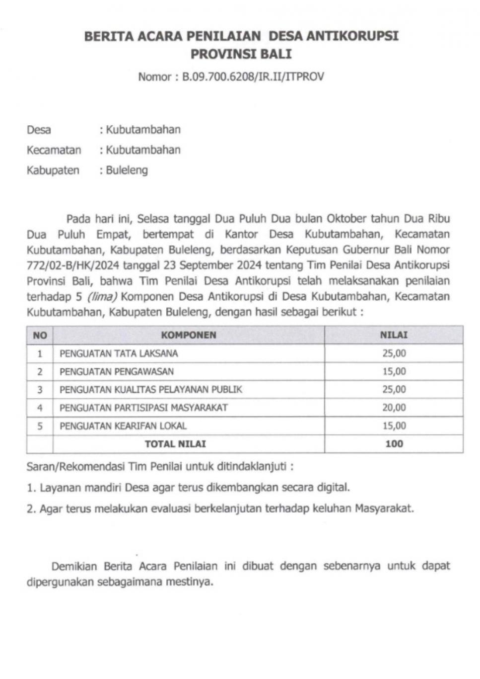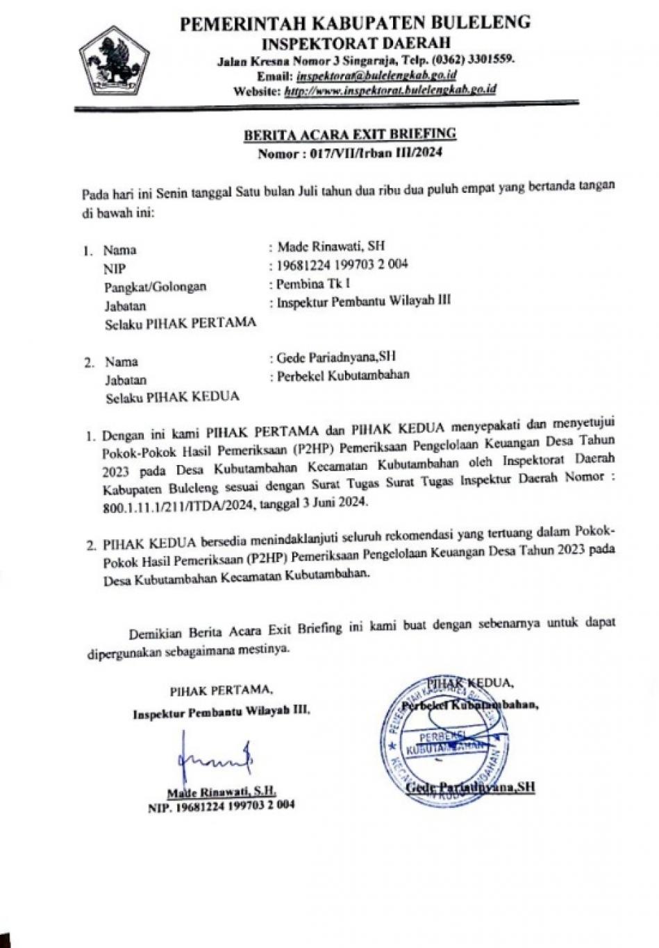 selain itu pula disini juga menginformasikan hasil pembinaan dari Inspektorat Wilayah Kabupaten Buleleng dan hasil penilaian Desa Anti Korupsi yang telah dilaksanakan pada tanggal 22 Oktober 2024 yang bertempat di Wantilan Desa Adat Kubutambahan. (Berita Acara Terlampir)
