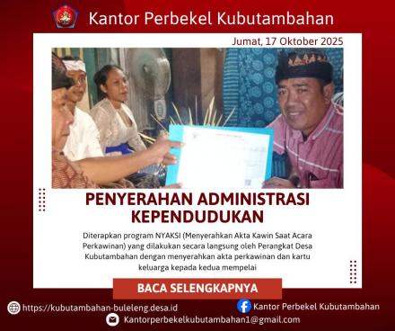 Kubutambahan (17/10) – Kebahagiaan pasangan pengantin baru di Desa Kubutambahan, Kecamatan Kubutambahan, Kabupaten Buleleng, hari ini terasa lengkap. Tepat pada Jumat, 17 Oktober 2025, setelah prosesi pernikahan, dua perangkat desa yang menjabat sebagai kepala wilayah terdekat, Kelian Banjar Dinas Tegal dan Kelian Banjar Dinas Kajekangin, menyerahkan langsung dokumen Administrasi Kependudukan (Adminduk) berupa Akta Perkawinan dan Kartu Keluarga (KK) yang sudah diperbarui kepada kedua mempelai.