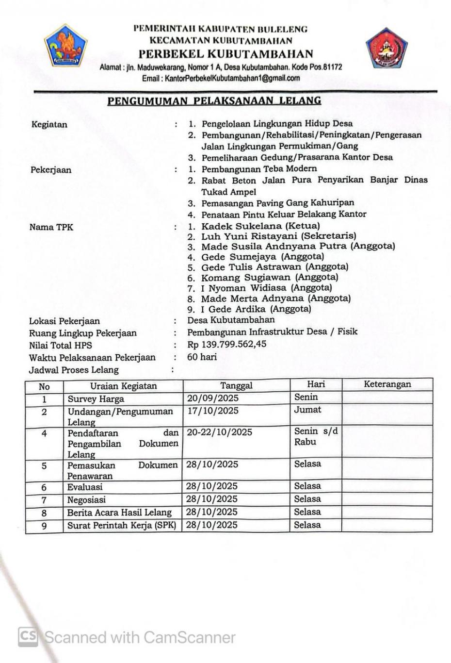 Dalam rangka melaksanakan Anggaran Pendapatan dan Belanja Desa (APBDes) Tahun Anggaran 2025 untuk Pembangunan Infrastruktur Kantor Desa/Fisik, Pelaksana Kegiatan Anggaran (PKA) dan Tim Pelaksana Kegiatan (TPK) Desa Kubutambahan dengan ini mengumumkan dan mengundang secara terbuka kepada seluruh Penyedia Barang/Jasa yang berminat dan memenuhi persyaratan untuk mengikuti proses lelang pengadaan barang, sebagai berikut di foto: