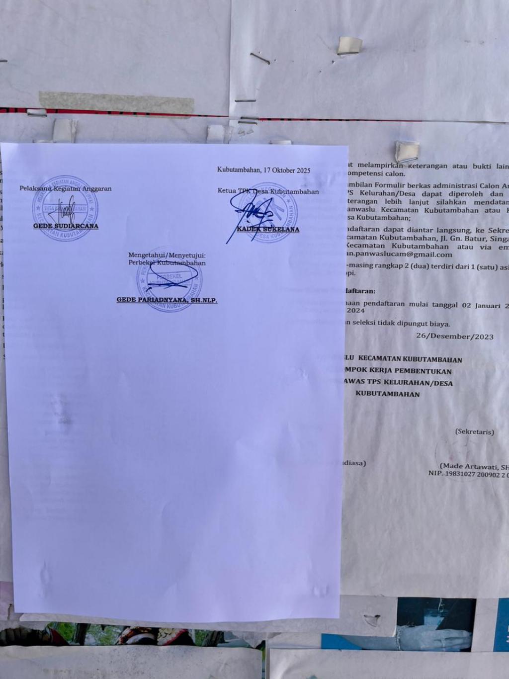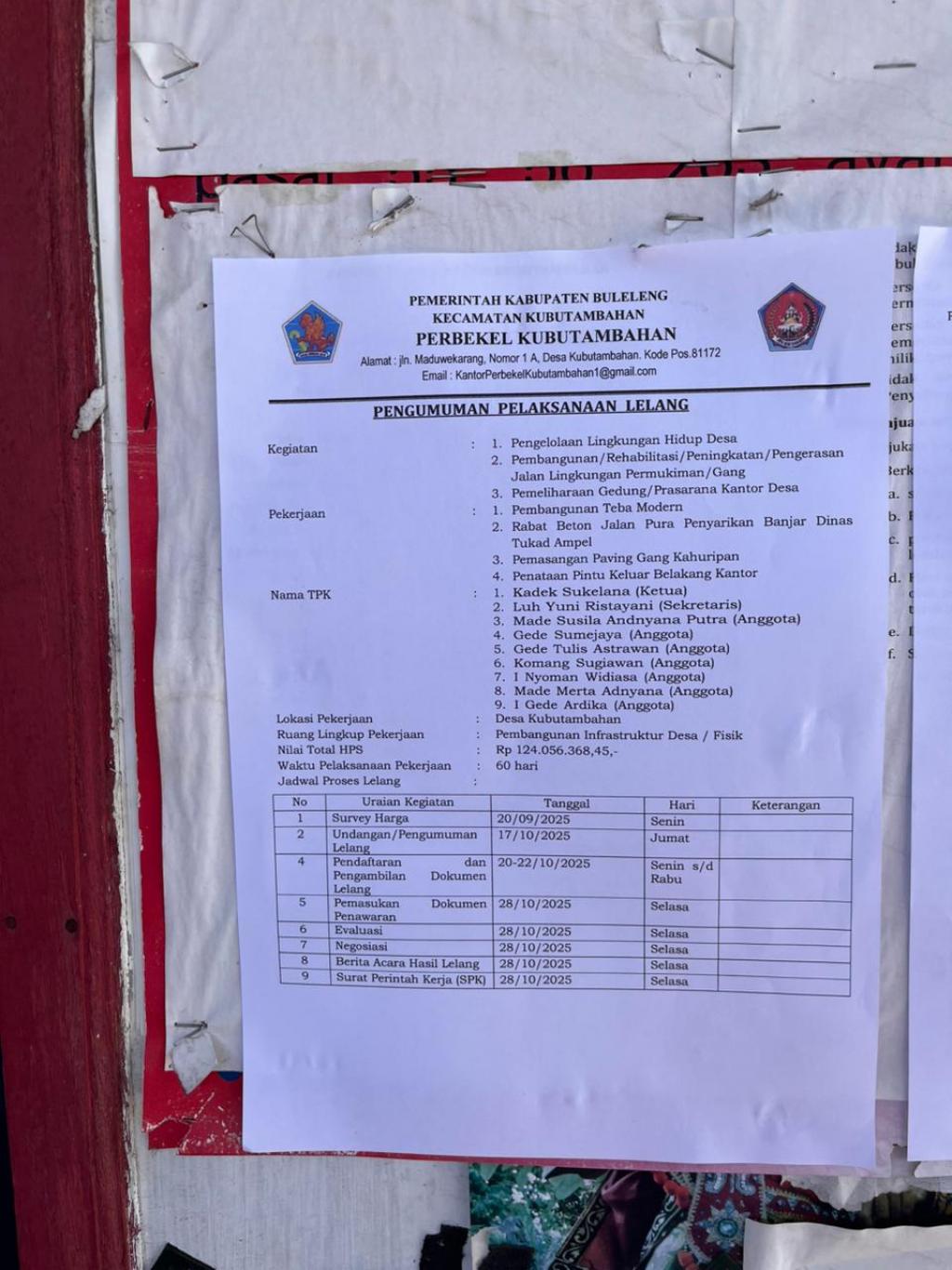 Hari ini, [Jumat, 17 Oktober 2025], Pelaksana Kegiatan Anggaran (PKA) dan Tim Pelaksana Kegiatan (TPK) Desa Kubutambahan melaksanakan salah satu tahapan penting dalam proses pengadaan barang dan jasa di desa, yaitu Pasang lembar "PENGUMUMAN RESMI PELAKSANAAN LELANG PENGADAAN BARANG: Pembangunan Infrastruktur Desa/Fisik" ini dengan rapi di Papan Pengumuman Utama Kantor Desa. Pastikan pengumuman terpasang dengan kuat, mudah dilihat, dan mudah dibaca oleh masyarakat umum, terutama para calon penyedia. Catat tanggal pemasangan dan segera laporkan kepada Ketua TPK/Sekretaris TPK bahwa pengumuman telah terpasang sebagai bagian dari dokumentasi kegiatan. Jaga agar pengumuman tetap utuh selama masa tayang (sesuai jadwal yang tertera di dalam pengumuman).