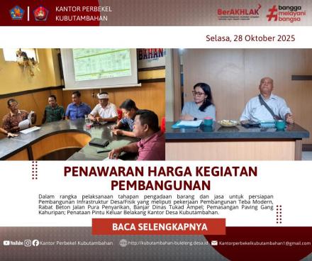 Kubutambahan, 28 Oktober 2025 – Bertempat di Ruang Rapat Kantor Perbekel Kubutambahan, hari ini Selasa, 28 Oktober 2025, telah diselenggarakan Rapat Kegiatan Penawaran Harga. Kegiatan ini merupakan tahapan krusial dalam proses pengadaan barang dan jasa untuk mempersiapkan pelaksanaan sejumlah proyek Pembangunan Infrastruktur Desa/Fisik tahun anggaran 2025.