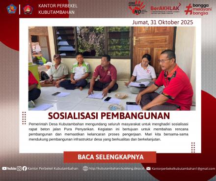 Kubutambahan, 30 Oktober 2025 – Tim Pelaksana Kegiatan (TPK) Desa Kubutambahan sukses menggelar rapat sosialisasi terkait rencana pelaksanaan pembangunan infrastruktur di Banjar Dinas Tukad Ampel. Acara ini berfokus pada Pembangunan/Rehabilitasi/Peningkatan/Pengerasan Jalan Lingkungan Permukiman/Gang Rabat Beton di Jalan Pura Penyarikan.