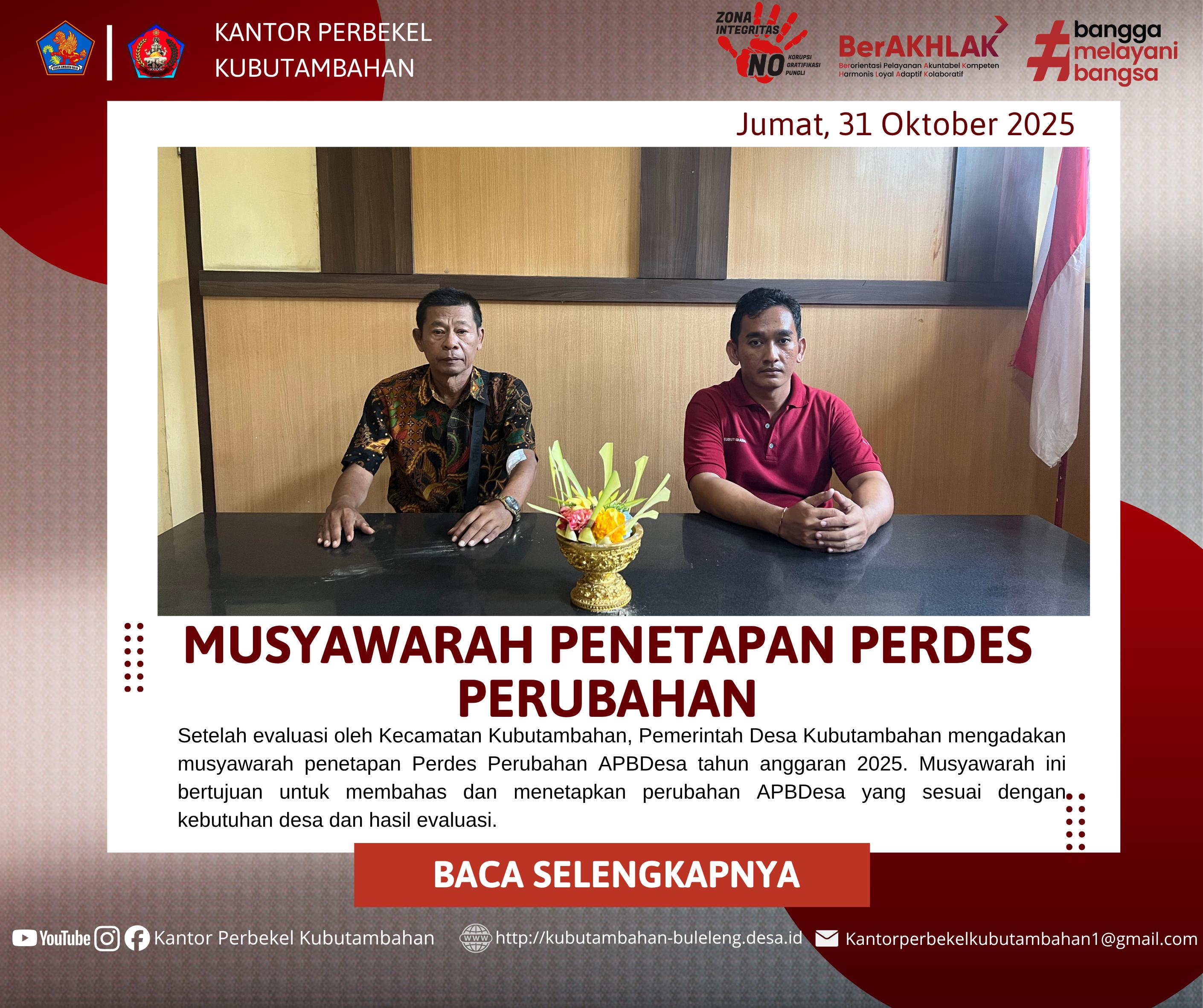 Kubutambahan, 31 Oktober 2025 – Pemerintah Desa dan Badan Permusyawaratan Desa (BPD) Kubutambahan menggelar Musyawarah Desa (Musdes) pada Jumat, 31 Oktober 2025, bertempat di Aula Kantor Perbekel. Musdes ini memiliki agenda tunggal dan krusial, yaitu Kesepakatan Bersama Perbekel dan BPD tentang Perubahan Kedua Atas Peraturan Desa Kubutambahan Nomor 8 tahun 2024 tentang Anggaran Pendapatan dan Belanja Desa (APBDes) Tahun 2025, sekaligus menindaklanjuti hasil evaluasi dari Tim Kecamatan.