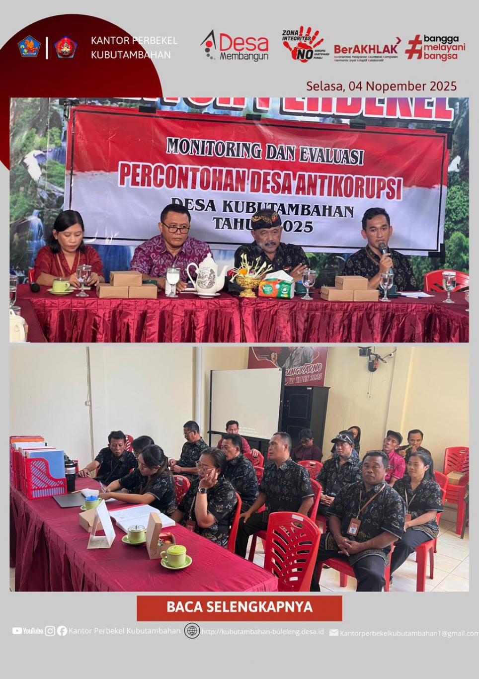 Kubutambahan, 4 November 2025 – Komitmen Desa Kubutambahan, Kecamatan Kubutambahan, Kabupaten Buleleng, dalam mewujudkan tata kelola pemerintahan yang bersih dan bebas korupsi kembali mendapat pengakuan. Hal ini ditegaskan dalam pelaksanaan Monitoring dan Evaluasi (Monev) Desa Antikorupsi Provinsi Bali Tahun 2025 yang dilaksanakan di Aula Kantor Perbekel Kubutambahan pada Selasa, 4 November 2025.