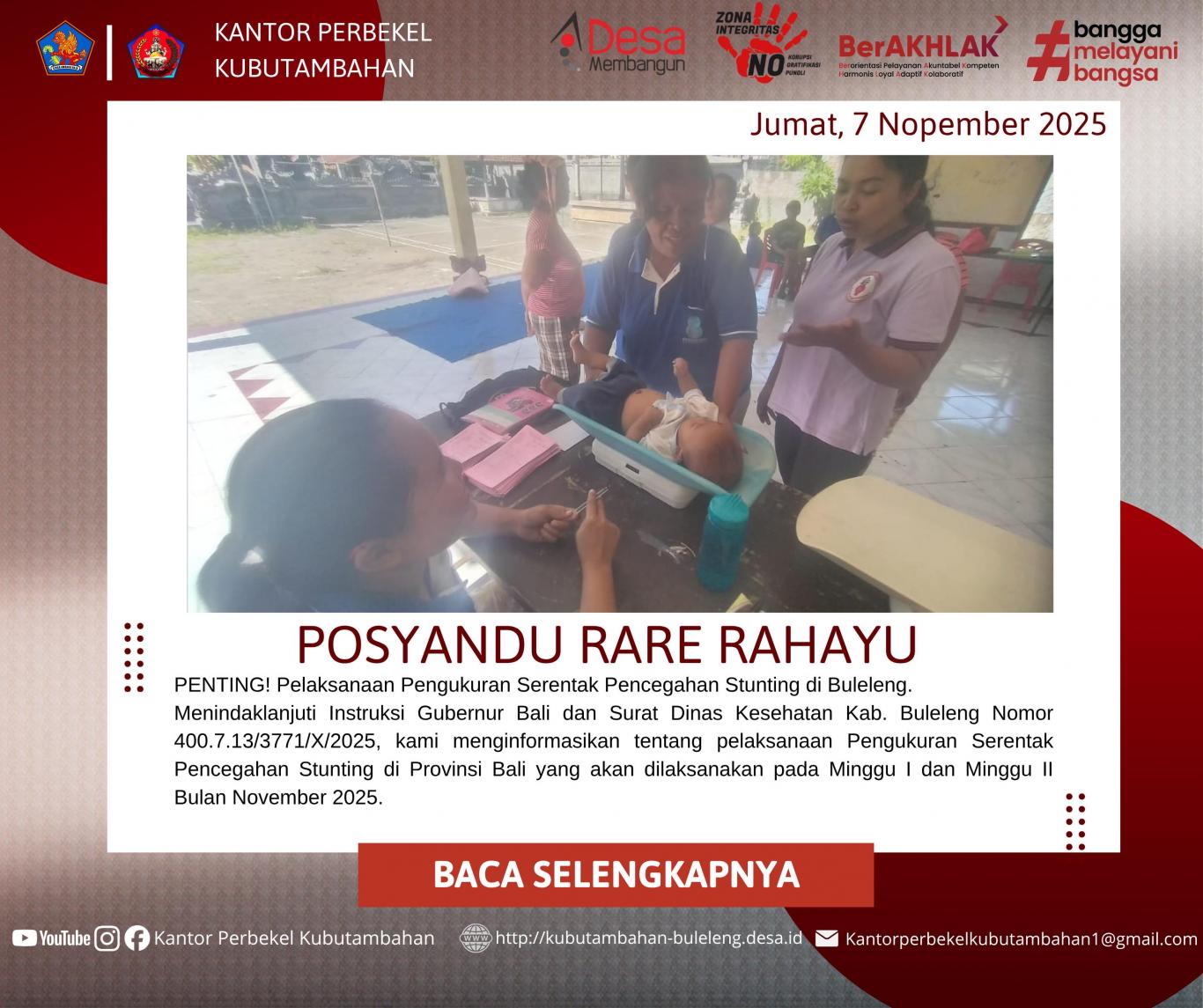 Kubutambahan, 7 November 2025 – Dalam upaya mewujudkan masyarakat yang sehat dan berkualitas di setiap tahapan usia, Posyandu Rare Rahayu di Desa Kubutambahan hari ini, Jumat (7/11), menggelar kegiatan rutin Posyandu Siklus Kehidupan (PSK). Kegiatan ini bukan sekadar Posyandu Balita biasa, melainkan sebuah layanan kesehatan terpadu yang merangkul seluruh warga desa, mulai dari janin dalam kandungan hingga lanjut usia (Lansia).