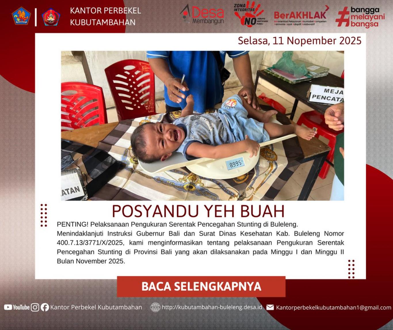 Kubutambahan, 11 November 2025 – Dalam upaya mewujudkan masyarakat yang sehat dan berkualitas di setiap tahapan usia, Posyandu Yeh Buah di Desa Kubutambahan hari ini, menggelar kegiatan rutin Posyandu Siklus Kehidupan (PSK). Kegiatan ini bukan sekadar Posyandu Balita biasa, melainkan sebuah layanan kesehatan terpadu yang merangkul seluruh warga desa, mulai dari janin dalam kandungan hingga lanjut usia (Lansia). Serta yang terpenting adalah Mencegah terjadinya Stunting pada tumbuh kembang anak.