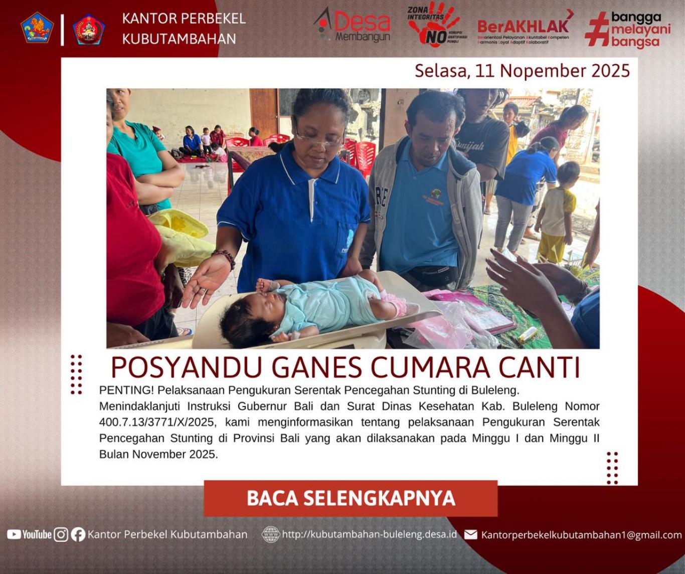 Kubutambahan, 11 November 2025 – Dalam upaya mewujudkan masyarakat yang sehat dan berkualitas di setiap tahapan usia, Posyandu Ganes Cumara Canti di Desa Kubutambahan hari ini, menggelar kegiatan rutin Posyandu Siklus Kehidupan (PSK). Kegiatan ini bukan sekadar Posyandu Balita biasa, melainkan sebuah layanan kesehatan terpadu yang merangkul seluruh warga desa, mulai dari janin dalam kandungan hingga lanjut usia (Lansia). Serta yang terpenting adalah Mencegah terjadinya Stunting pada tumbuh kembang anak.